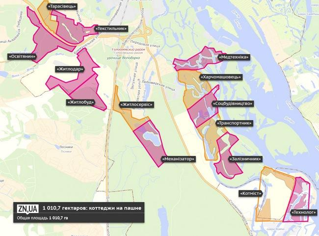 74, 5 га (Конча-Заспа); «Освітянин»; «Механизатор». Удивительно инкубаторские названия, не правда ли?.. «Житлобуд» - 184 га (ул. Академика Заболотного), «Тарасовец» - 42 га (улица Академика Заболотного) - это все в Голосеево. Всего 1010 га. (см. рис. 3. на сайте) Остальные разбросаны.