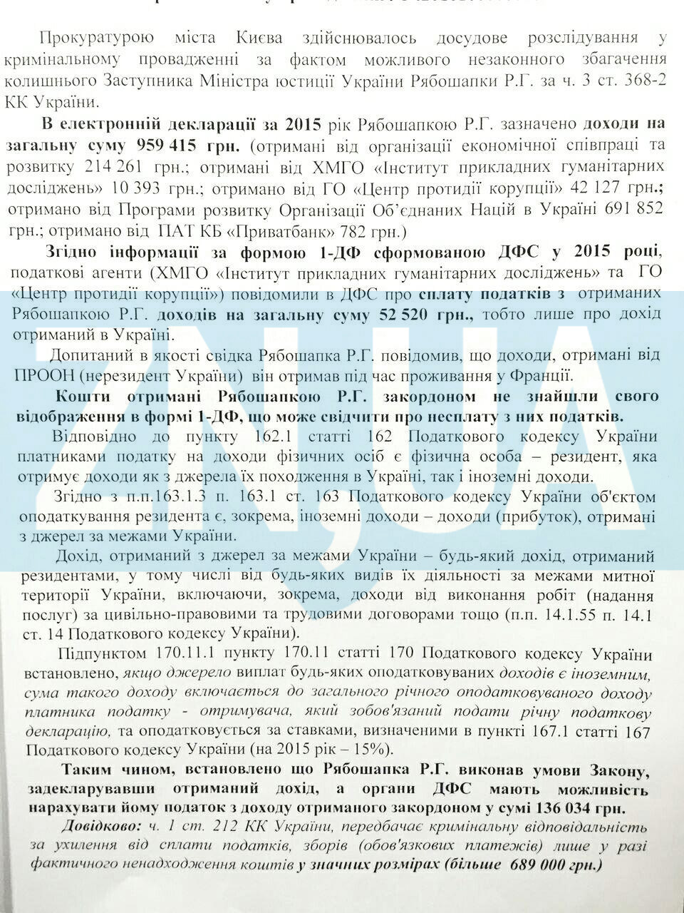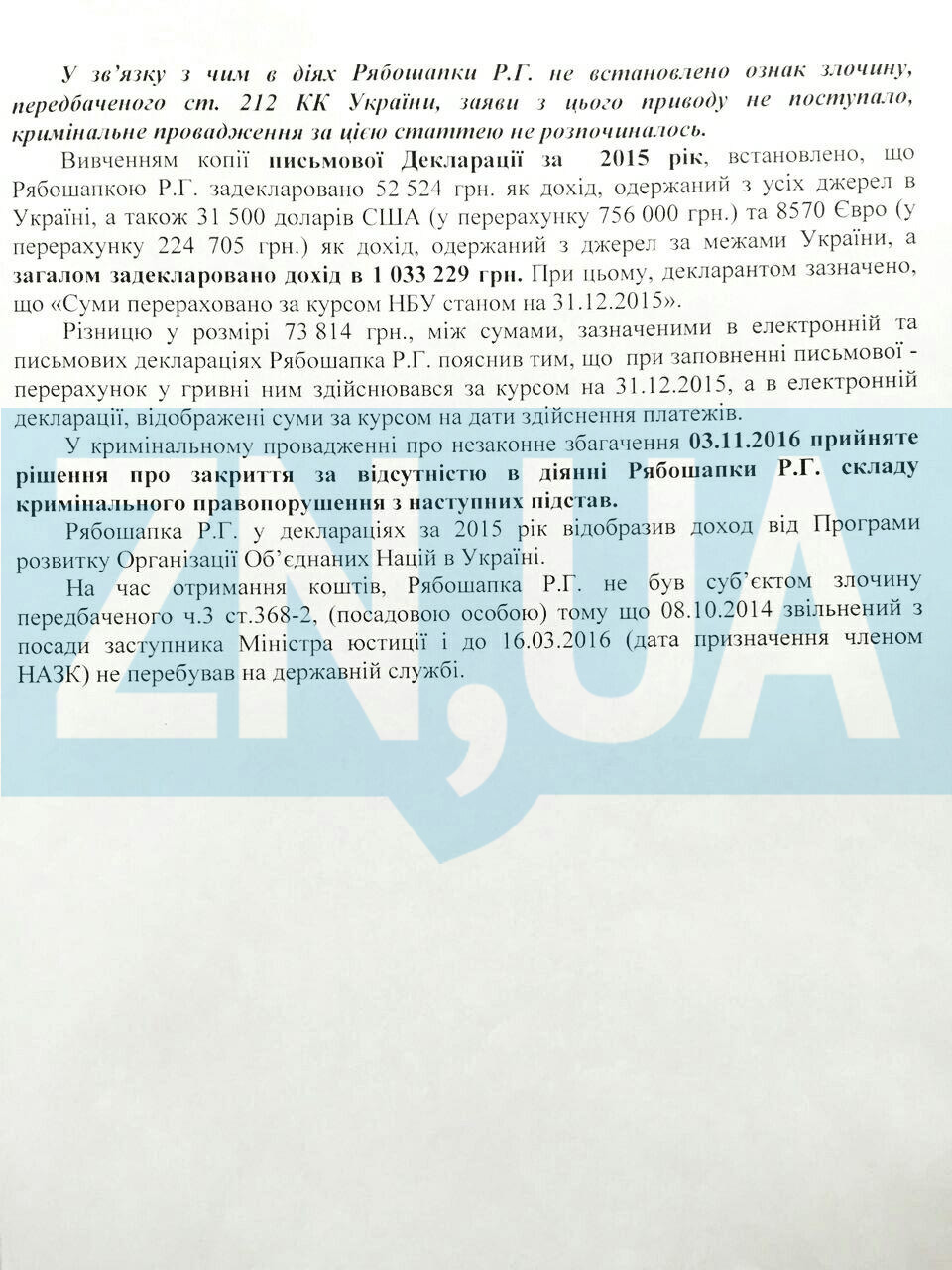 "В уголовном производстве о незаконном обогащении 03.11.2016 принято решение о закрытии из-за отсутствия в деянии Рябошапки Р. Г. Состав уголовного преступления по следующим основаниям", - говорится в документе.