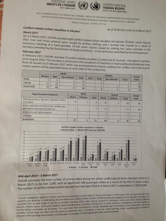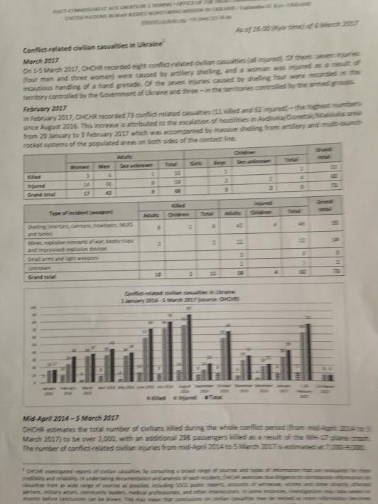 В ООН отметили, что за 28 дней февраля года погибли 11 мирных жителей, еще 62 получили ранения, что стало самым высоким показателем с августа 2016 года. Рост числа жертв обусловлен эскалацией боевых действий в районе Авдеевки, Донецка, Макеевки с 29 января по 3 февраля 2017 года.