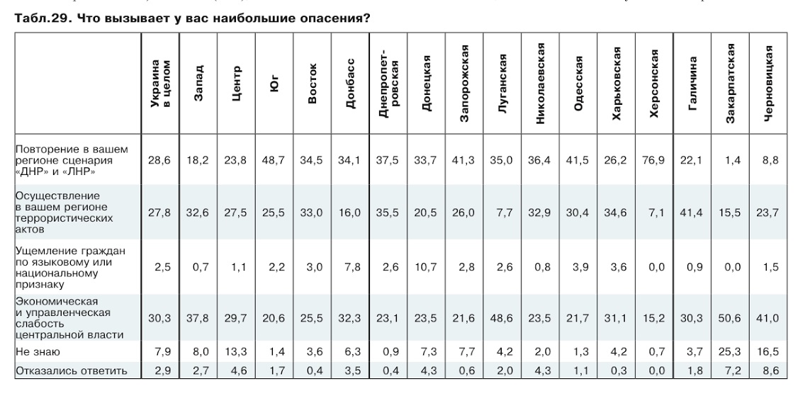 Так, отвечая на вопросы относительно опасений, где количество вариантов было ограничено пятью вариантами, в целом по стране украинцы выделили три ключевых страха, проценты по которым распределились практически поровну: слабостью центральной власти (30,3%), угрозой терактов (28,6%) и повторением сценариев "ДНР–ЛНР" в своем регионе (27,8%).