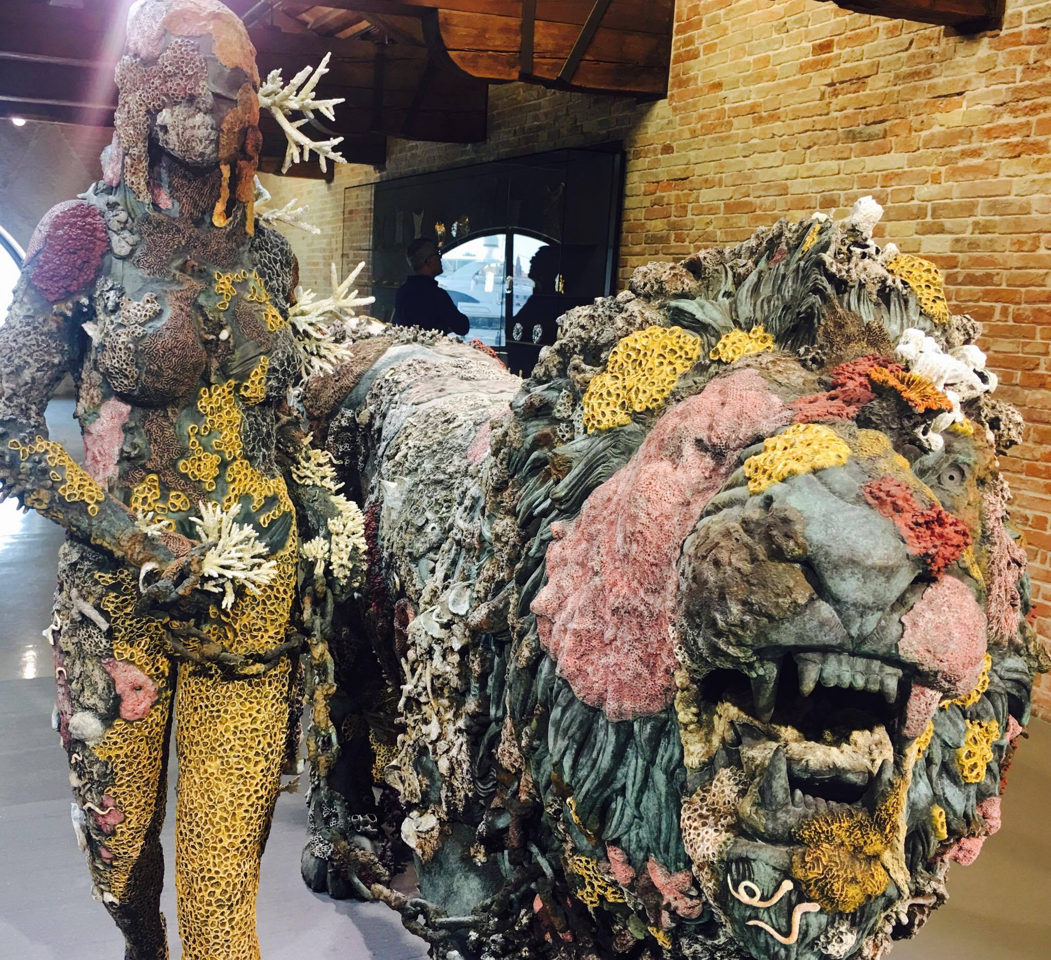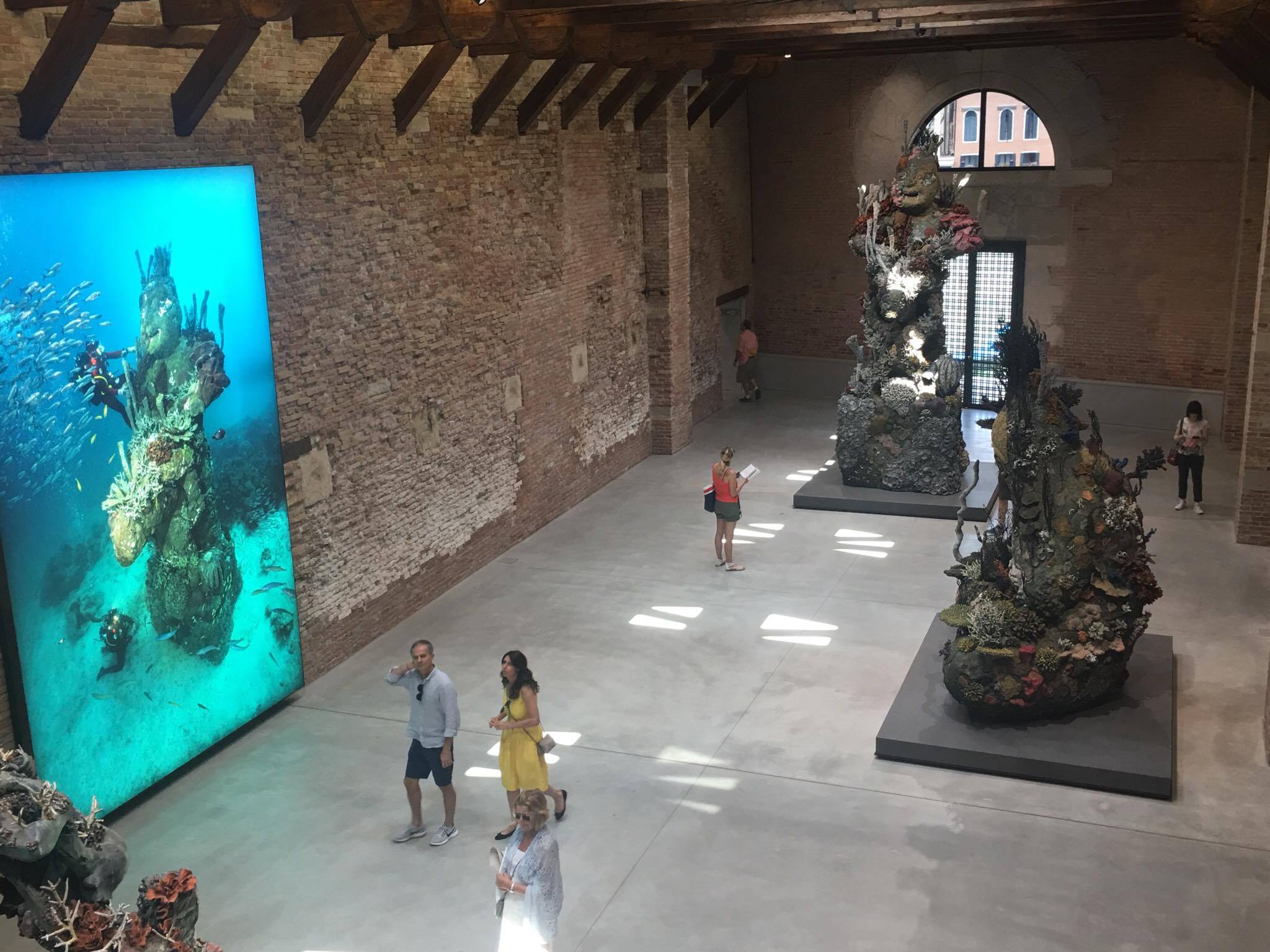 Здесь, в Венеции, Хёрст проверяет веру зрителя на прочность. "Верю - не верю", или как далеко готово воображение пройти вместе с дерзкой экспозицией Хёрста. Водолазы спасли более 100 работ - гигантские скульптуры морских монстров, инкрустированных коралловыми и полудрагоценными камнями, золотые обезьяны, единороги из горного хрусталя, оружие, идолы, черепахи, львы и медведи, Будда, фараон из голубого гранита, невероятно повторяющий черты лица Фаррелла Уильямса, бюст богини-двойника солистки группы "Ди Антвурд" Йоланди, мраморная Нефертити с чертами Рианны, бронзовый Микки Маус, богиня Кейт Мосс, в некоторых образах можно распознать самого Хёрста, на скульптурах многовековой отпечаток морского разрушения. Античность, смешанная с "новыми богами и идолами" современности. На вопрос, правда ли автор был вдохновлен некоторыми знаменитостями, Хёрст отвечает: "Все зависит от вас - верите ли вы".