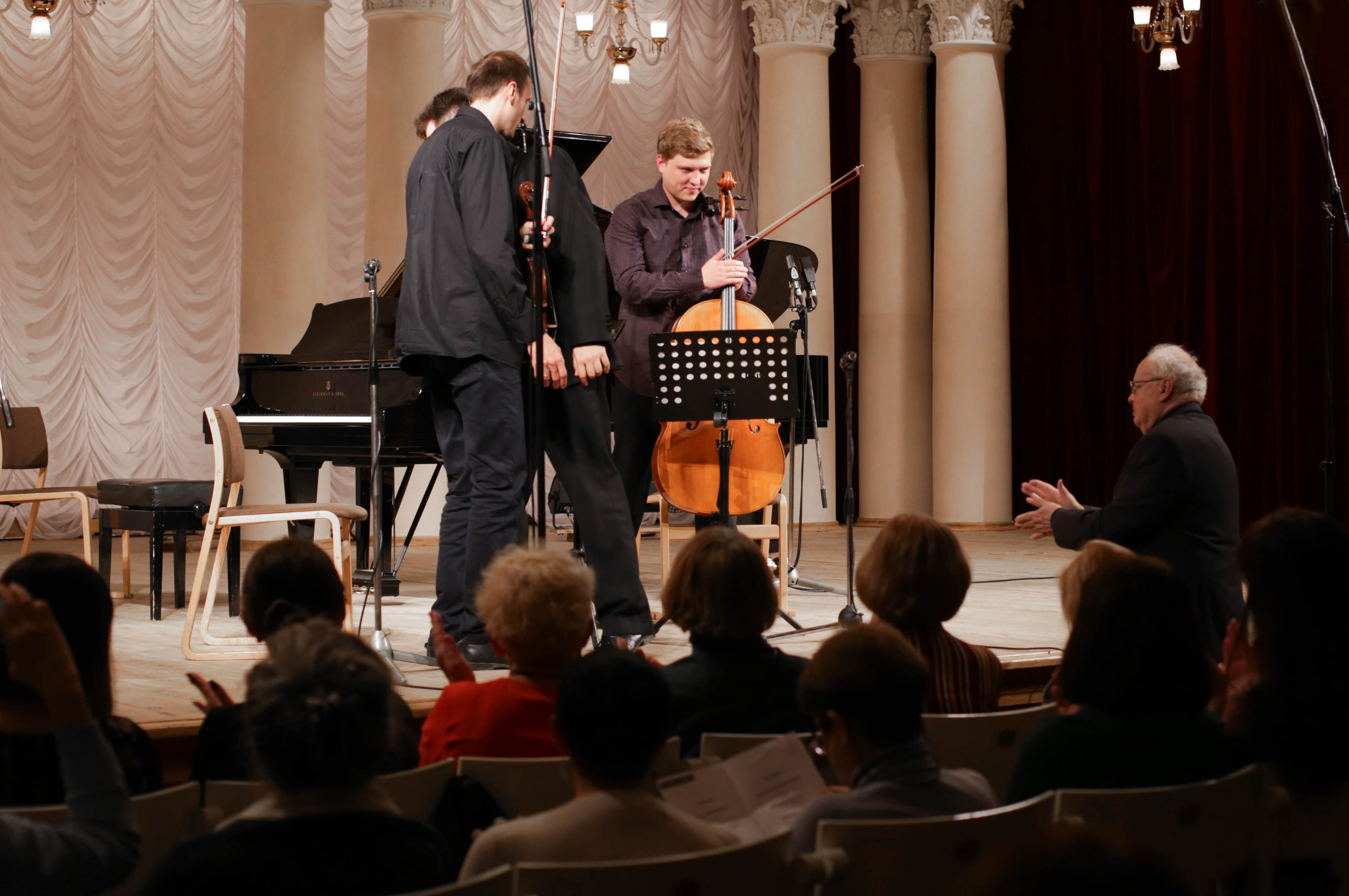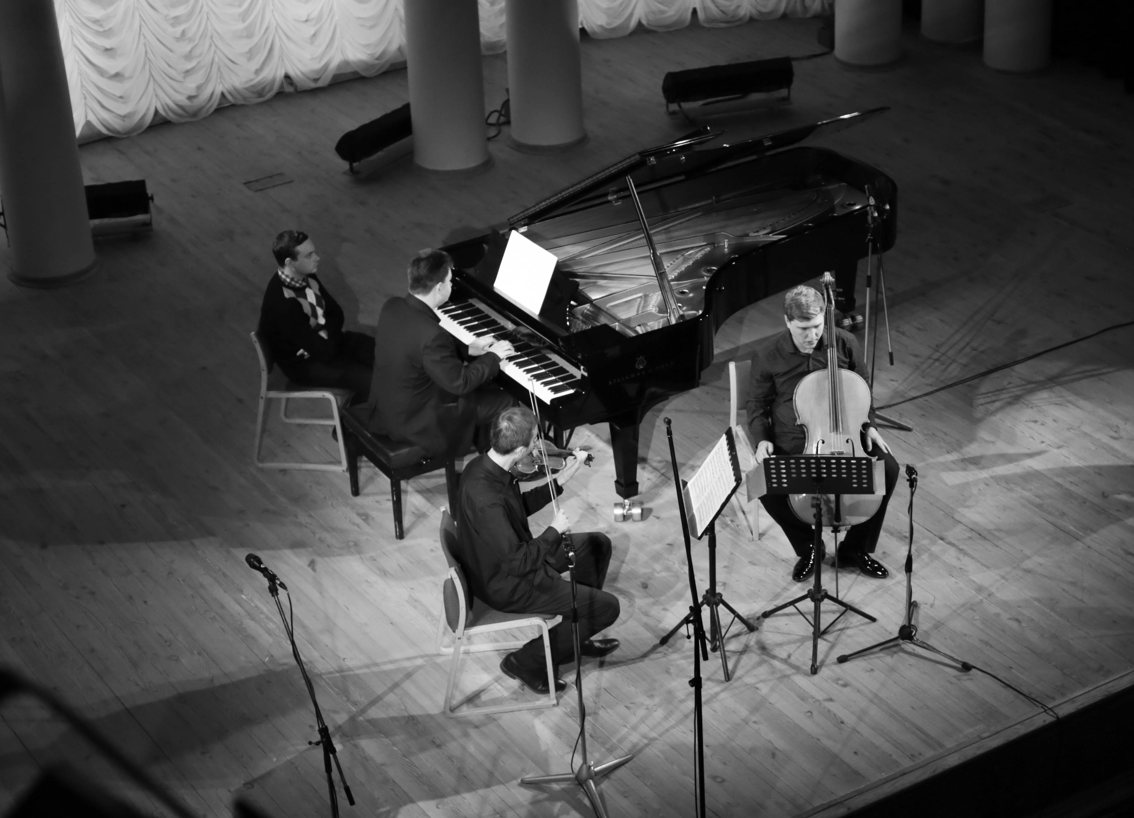 На концерте "Лятошинский-Трио" также был аншлаг. В его составе участвуют талантливый киевский пианист Роман Лопатинский - лауреат многих сольных конкурсов (наиболее известные - Конкурс Владимира Горовица (Украина), Международный конкурс пианистов им. Ферруччо Бузони (Италия), конкурс Hamamatsu (Япония) - О.К.). Музыкант много гастролирует с сольными программами, он участник других камерных коллективов, в частности - стремительно развивающегося NotaBene Chamber group. Струнные инструменты в трио представляют экс-харьковчане Михаил Захаров (скрипка, Украина-Австрия) и Алексей Шадрин (виолончель, Украина-Германия).