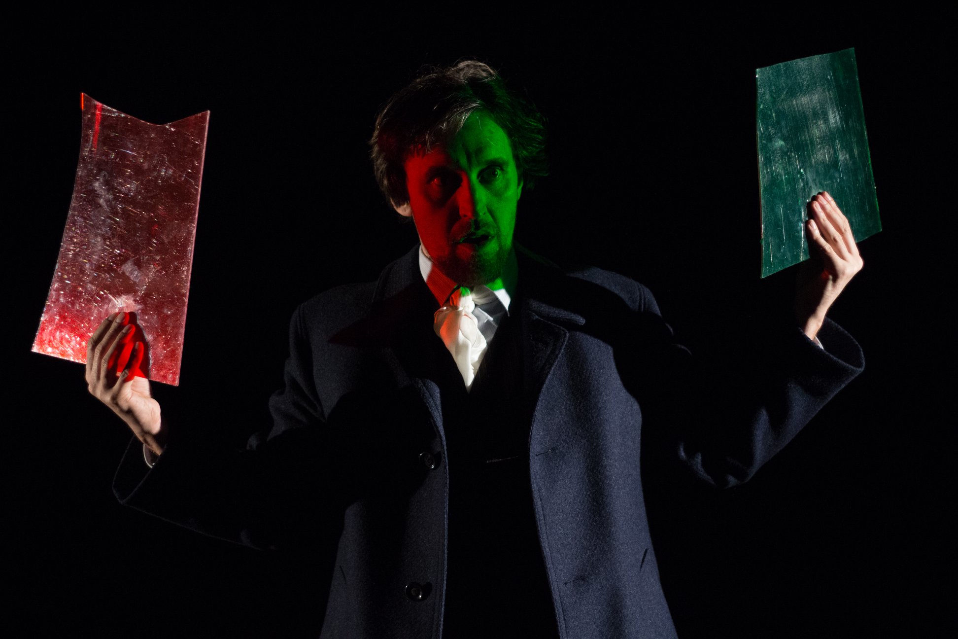 Это театр, в котором Рафалович - не позитивный народолюб, а человек раздвоенный, из него вынуты струны, а осталась только рефлексирующая оболочка, под которой, возможно, и прячется "тот" самый? Одна из лучших сцен, когда Рафалович (Николай Береза) прижимает к вискам осколки витража - зеленый и красный, и лицо его пополам разрезают две краски, две потусторонние маски, за которыми и предполагается "тот", который грядет.