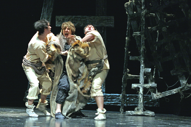 Эмоциональным пиком и финальной точкой его спектакля становится пронзительно решенная, трагическая сцена смерти Софии. В высшей степени раздражения, окончательно загнанный в угол, уставший бороться и не видящий разрешения ситуации, Гнат хватает плачущую Софию и запахивает ее в свою волчью шубу. И в этот момент по-настоящему становясь зверем буквально "душит ее в своих объятьях". Спустя мгновение затихает бьющаяся, задыхающаяся София, выскальзывая вниз уже неживой. Медленно идет герой в глубину сцены, касается рукой детской колыбели. Тихо качнулась эта колыбель с так и не родившейся новой жизнью…