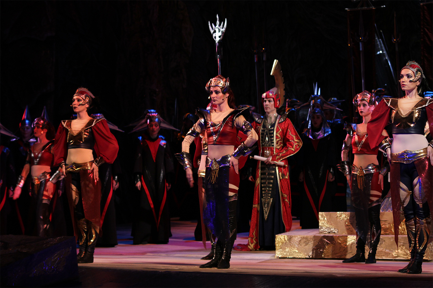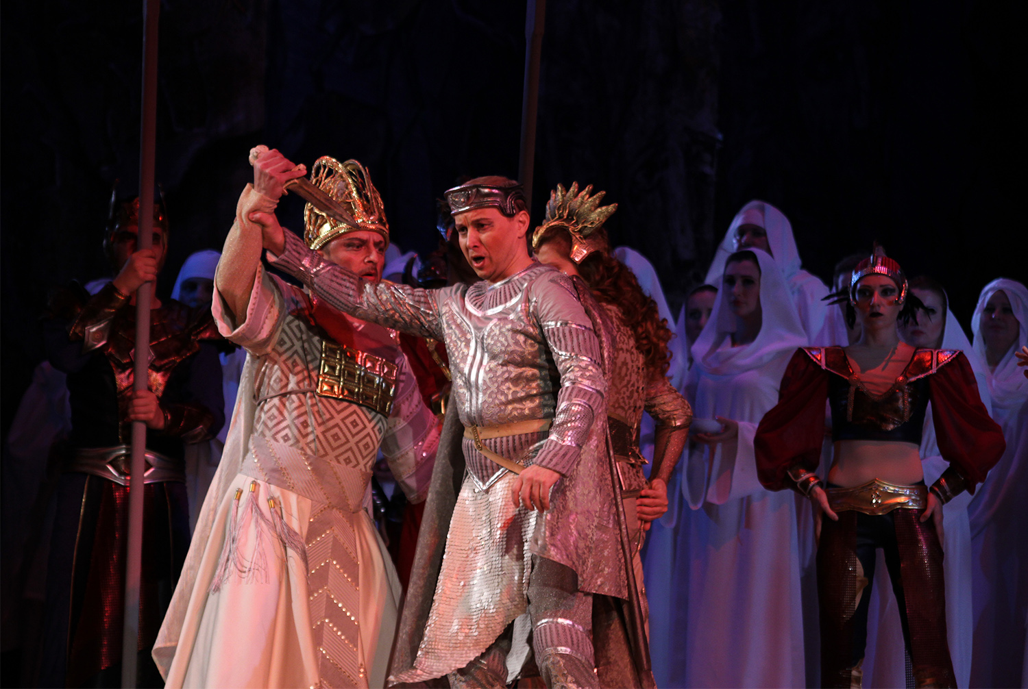 К современности приближают ощетинившиеся пиками на заднем плане ракетные установки, а также мечи-бластеры, надеваемые Набукко и Абигайль как наручи. Теплый песчаник сценического половика со звездой Давида по центру, каменные кулисы становятся канвой, по которой вышивает восточные узоры художник по костюмам Сергей Васильев. Пожалуй, ни в каком другом оперном спектакле на одесской сцене важность одежды персонажей не была поднята на такую высоту. Иудеи облачены в светлые, мягкие, струящиеся ткани, помыслы их стремятся к духовным высотам, ассирийцы же выбирают земную тщету и роскошь - дорогие, жесткие ткани, металлизированный блеск, жаккард, кожа, тафта цвета изумруда и бордо, "рогатые" шлемы. Дирижер-постановщик, народный артист Республики Молдова Александру Самоилэ подчеркнул контраст двух миров: одного - хлесткого, ревущего, кичливого, другого - поющего духовные псалмы, кроткого и жертвенного.