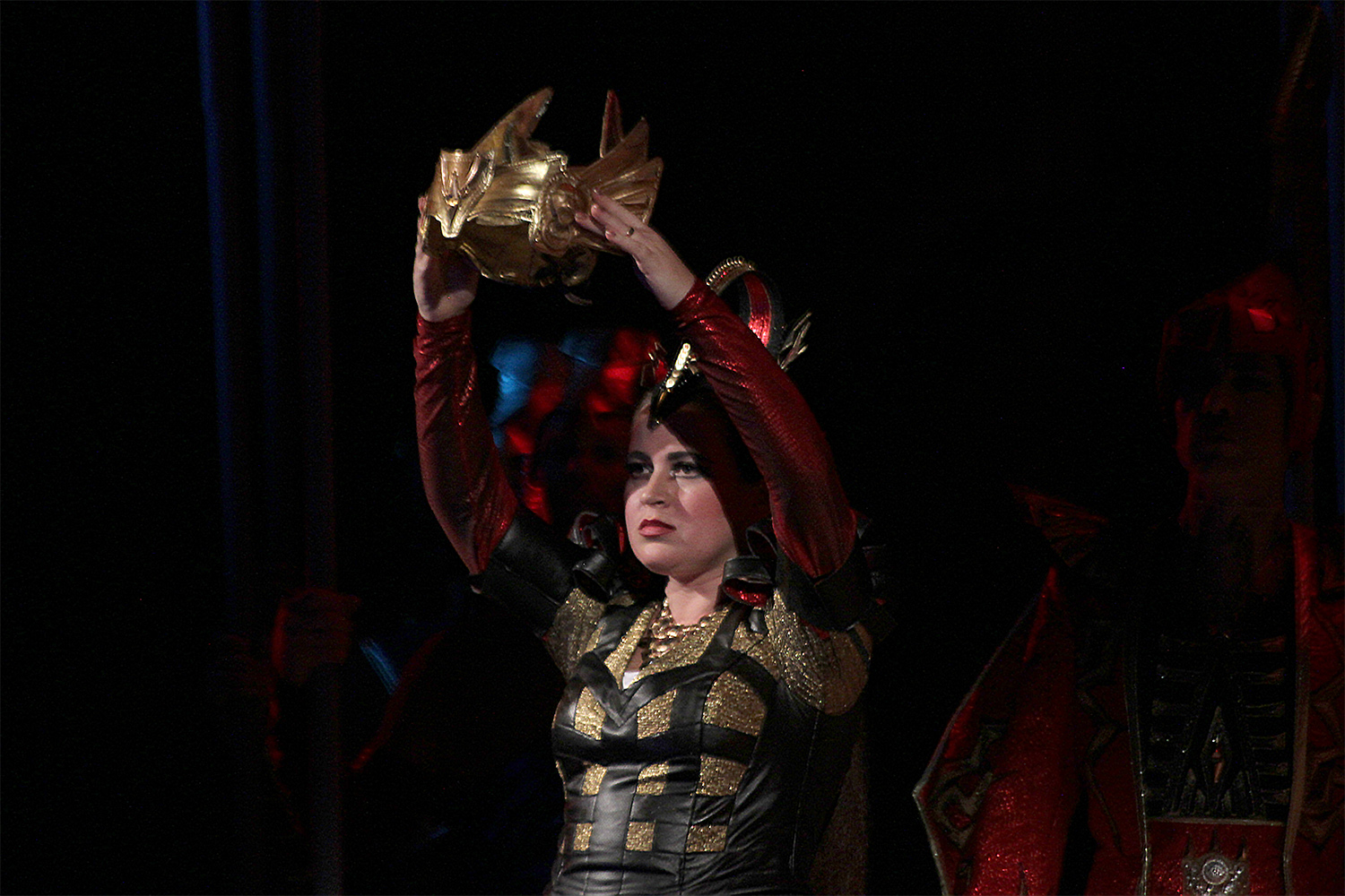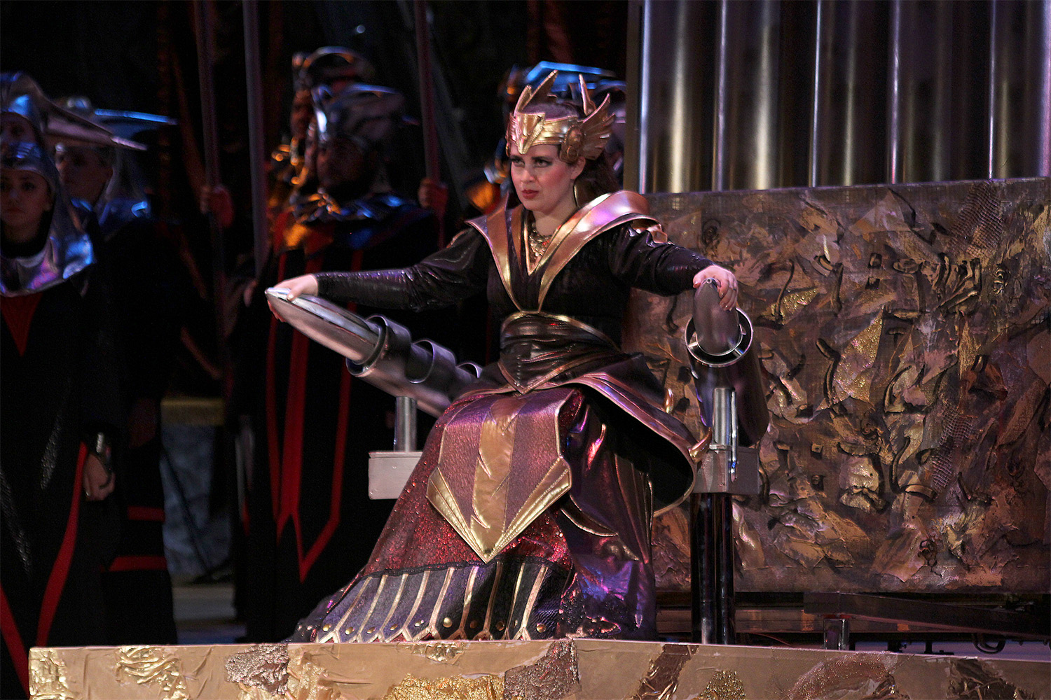 И здесь голос певицы выделывает немыслимые фиоритуры, то поднимаясь на недосягаемую высоту, то коварно замирая на низких нотах. Стоя рядом с верховным жрецом вала (Сергей Узун), Абигайль обнаруживает с ним сходство - блестящая скелетообразная вышивка украшает их одеяния, это люди, мягко говоря, сходных духовных поисков, идущие к власти через кровь и манипуляции. А что корона Набукко напоминает нечто среднее между античным лавровым венком и шлемом викинга, - тоже красноречивая деталь.