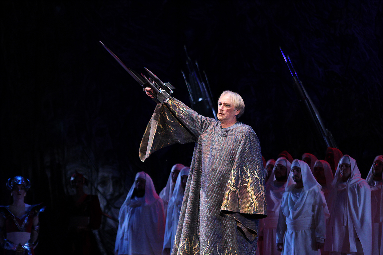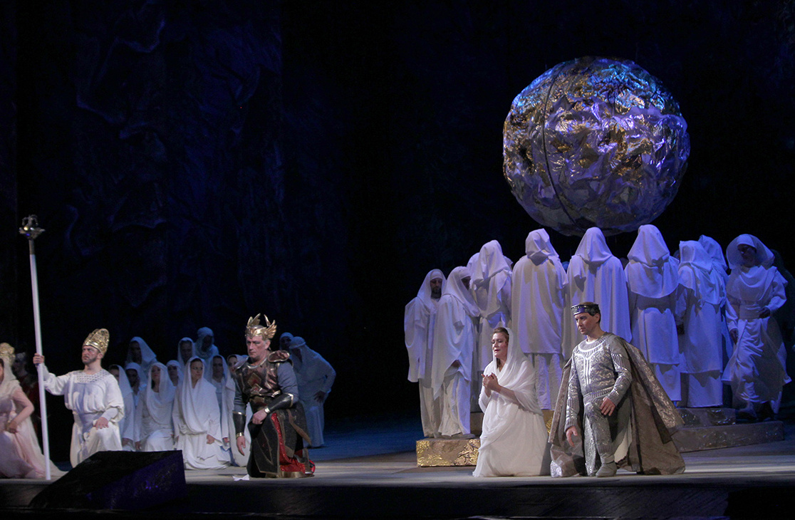 Этот красноречивый образ приравнивает разрушение храма Иерусалимского к вселенской катастрофе. А миниатюрная светодиодная копия этого шарика помещена внутри золотого ажурного клобука первосвященника Захарии (молодой бас Дмитрий Павлюк проявил себя истинным виртуозом и при этом стойко носил тяжелый головной убор), словно сотканного из веток и листьев. Верой спасемся?..