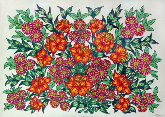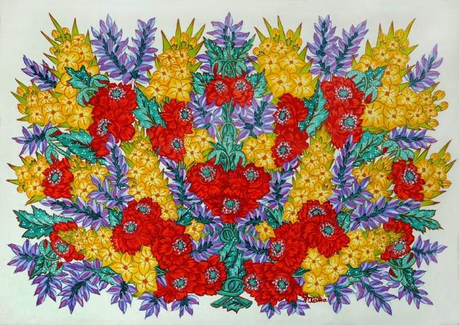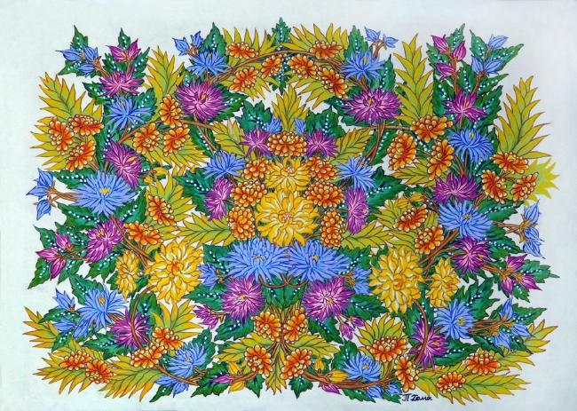 Она приняла за основу любимые георгины, пионы, маки, хризантемы... и нарисовала их в авторской интерпретации. Все варианты разные, что свидетельствует о незаурядном даре декоративного переосмысления природы. Тем более что нигде не изучала рисование. "Я училась у природы, у себя", - говорит Параска Хома.
