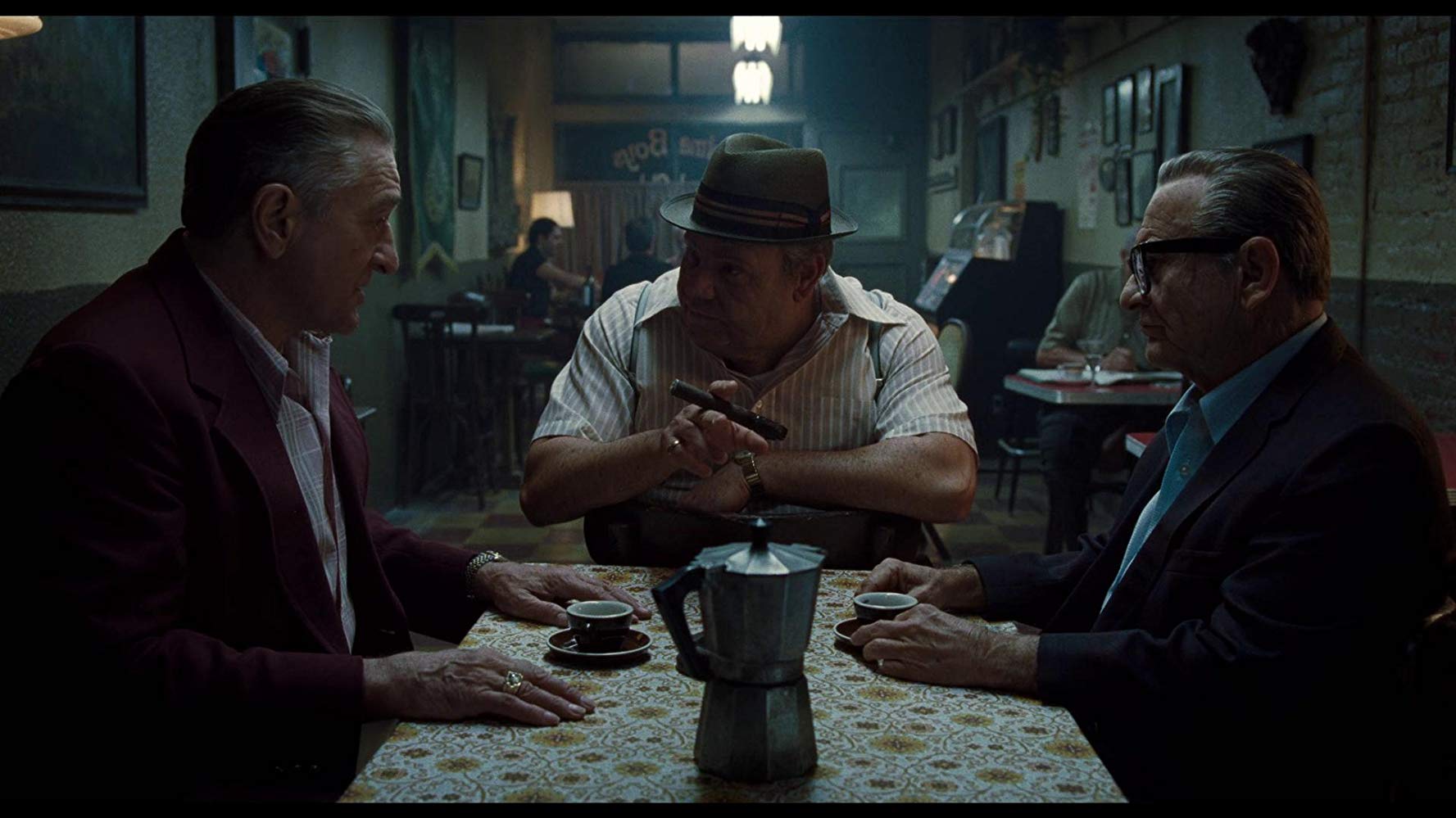 В некоем смысле подобная метафора Скорсезе сродни поэтике его же "Ирландца". Поскольку этот фильм - арсенал былого боевого оружия, спрятанного на дне памяти самого режиссера и многих поклонников мафиозной киномифологии. Собственно говоря, "Ирландец" - это попытка Скорсезе извлечь из дна темных вод все свои боеприпасы и не просто открыть огонь, а постараться создать ту самую внесюжетную "химию", которая отличала и его картины, и все картины подобного русла, включая "Крестного отца", "Однажды в Америке" и другие.