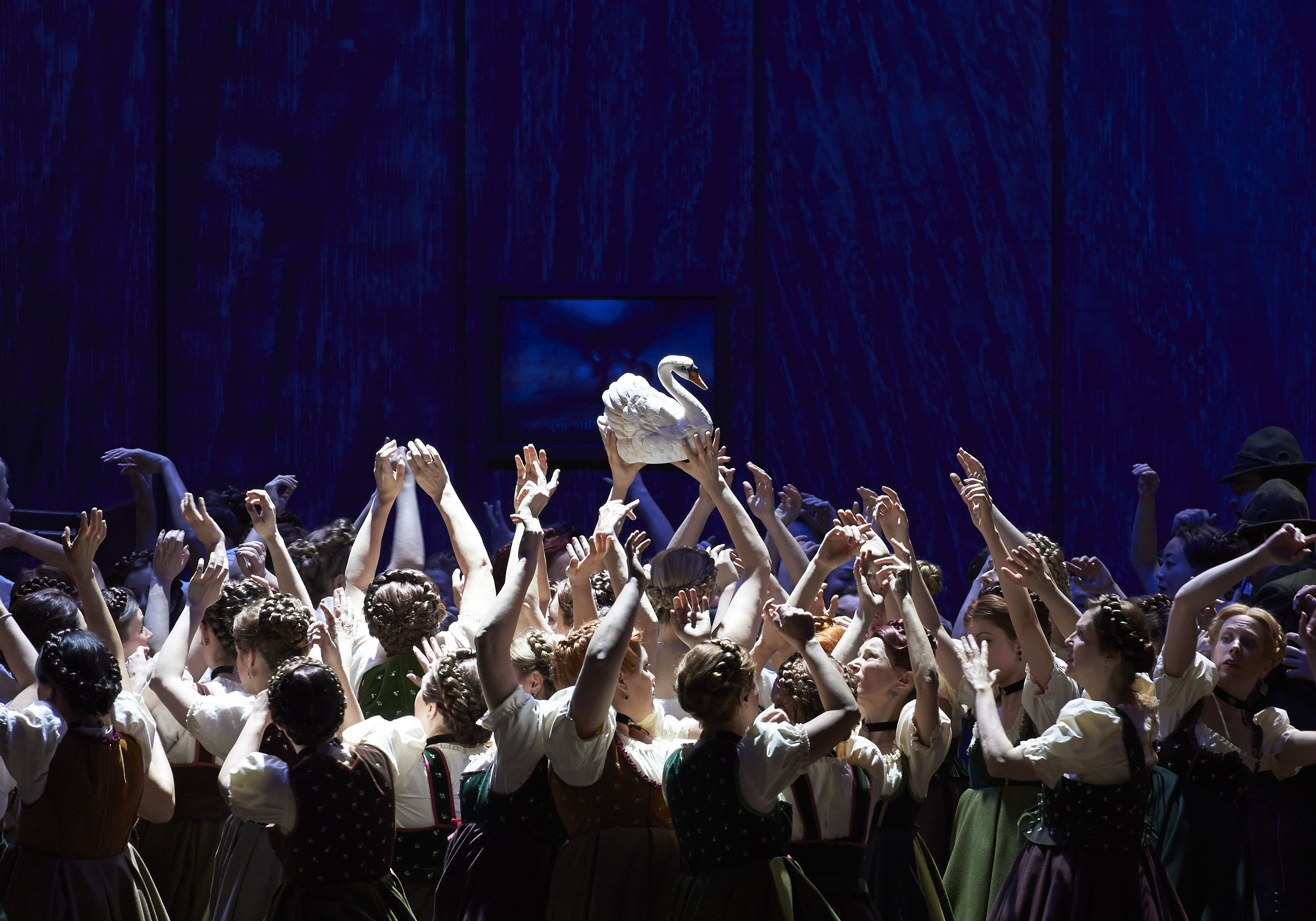 Утрированно декоративным, ненастоящим выглядит и один из главных образов оперы - лебедь, на котором рыцарь Грааля Лоэнгрин прибывает по волнам Шельды спасать Эльзу, и которого в самом конце преданный не сдержавшей обещание Эльзой Лоэнгрин превращает в брата главной героини Готфрида. Лебедь являет собой небольшую пластиковую игрушку, напоминающую утенка для ванной. Его появление в самые драматичные моменты невольно сбивает зрителя с серьезного восприятия спектакля. Вся эта "лакированность" образов и упрощение смыслов превращают персонажей одной из самых популярных опер Вагнера в безвольных марионеток, которые становятся жертвами то ли безжалостного рока, то ли собственной глупости. Редкие случаи, когда герои лишаются своей картиночной условности и "очеловечиваются" - это эпизоды, где на пике эмоционального напряжения они показаны без трахта, а в одной белой нательной рубахе или платье. Таким мы видим вздрагивающего в позе эмбриона и беззащитного пред миром людей Лоэнгрина в момент его появления на сцене; такой оказывается слабая перед натиском чужих интриг Эльза; такими предстают Ортруда и Тельрамунд, униженные поражением последнего в поединке с Лоэнгрином; таким же появляется в конце оперы воскресший брат Эльзы Готфрид… Все остальное время трахт выполняет функцию защиты и одновременно оправдания для всех персонажей: все они связаны территориальной и этической общностью, и все одинаково виноваты в происходящей драме.