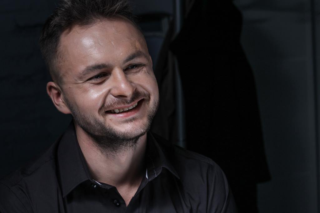 Но когда он сидит в кафе напротив, или с блеском играет Сашу в спектакле "Тату, ти мене любив?" (театр "Золотые ворота"), или когда хитро смотрит своими глазами-туннелями, будто что-то скрывая или умышленно демонстрируя, вот тогда и понятно, что не все так просто с внешним образом этого безусловно перспективного и очень талантливого актера.