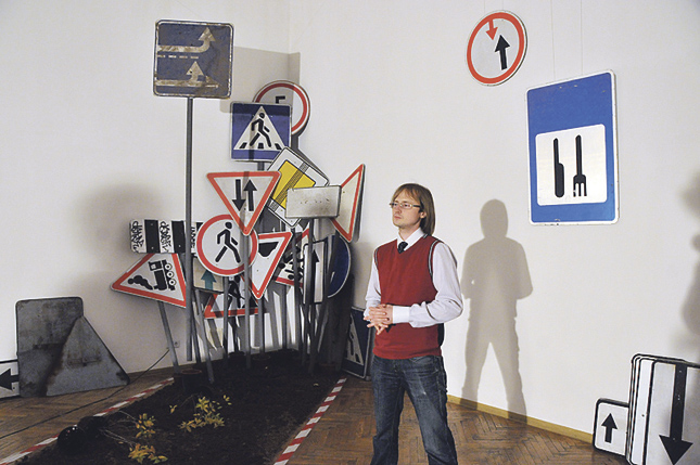 Мы стоим в "среднем" зале напротив засыпанного черноземом помоста-стола под белой скатертью. Здесь множество аутентичных дорожных знаков. (Кауфман сказал, что "собирал" их по украинским дорогам). И еще несколько пожелтевших молоденьких кустиков в пластиковых горшках, а также уже вынутых из своего горшка-"дома". ("Растение думает, что свободно, когда растет к Солнцу. Но на самом деле его рост ограничен размерами горшка" - Кауфман).