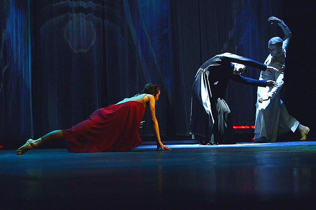 Но еще более существенно Раду переиграл линию старого казака Сотника (Артем Шошин) и его дочери - красавцы-ведьмы Панночки (Елена Салтыкова), а затем и Вия с его многочисленной челядью. В балете они любовники то ли из высшего света, то ли из потустороннего мира, вторжение в который стоит жизни самому Хоме. Этот мир - ярко-красный на цвет, невероятно эротичный (и Сотник, и Панночка танцуют полуобнаженные), может прельстить не только наивного Брута, но и всю массовку бурсаков, которые во втором действии меняют человеческие лица на безобразные маски и переходят на темную сторону. Где, кстати, два вожака: вполне реальный Сотник и "теневой" Вий, из глазных впадин которого Панночка медленно извлекает две красные полоски материи - те кровавые слезы, которыми она сама плачет в гробу в повести Гоголя.