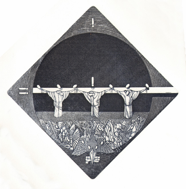 -Если провести параллель с короткой автобиографией мастера, можно заметить, что есть даты, которые Аксинин выделял. Они касаются переломных моментов в личной в интеллектуальной жизни художника, отображают эволюцию его взглядов. Начиная с 1981 г., Аксинин все больше увлекался восточной философией, в графике сдержанно и лаконично пользовался средствами художественной выразительности. Он и до этого практически все работы выполнял с помощью линии и точки. Однако на смену полной структуризации содержания работы, ее плотному заполнению пришла лаконичная центральная композиция. Массивное черное пространство стало неотъемлемой чертой его работ. Одинокие фигуры в пустынном пространстве оставляют больше загадок, чем дают ответов. В отличие от визуальной нагрузки, трансцендентальный объем его работ только увеличился. Я бы сравнил их звучание с тибетскими колоколами.
