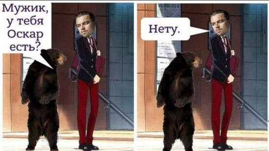 Пользователи в соцсетях публикуют фотожабы на тему долгого пути актера к награде. Пользователи иронизируют, что именно сцена драки с медведем в фильме принесла голливудской звезде "Оскар".