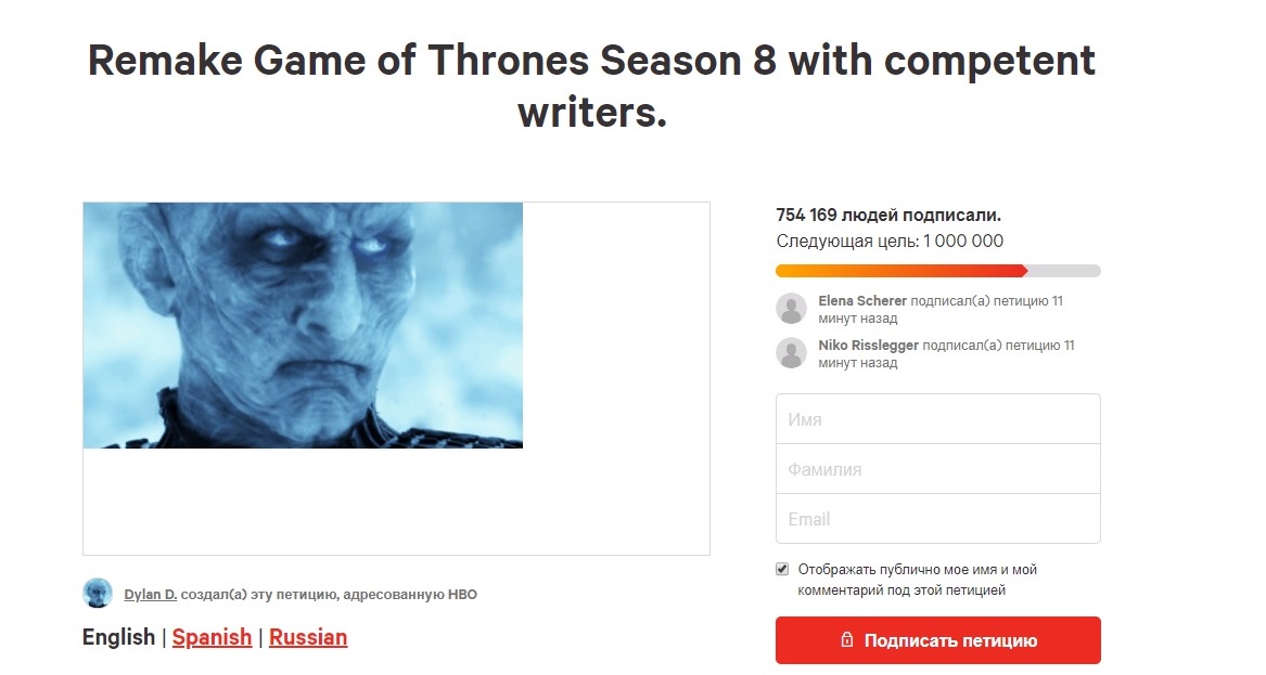 Фанаты сериала "Игра престолов" требуют у канала НВО переснять последний сезон "с компетентными сценаристами". На момент написания новости петиция с соответствующим требованием собрала на сайте Change.org более 754 тысяч подписей.