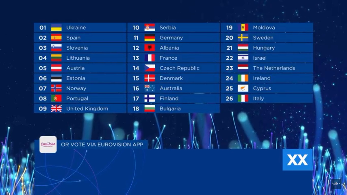 Порядок выступления в финале такой: Украина, Испания, Словения, Литва, Австрия, Эстония, Норвегия, Португалия, Великобритания, Сербия, Германия, Албания, Франция, Чешская Республика, Дания, Австралия, Финляндия, Болгария, Молдова, Швеция, Венгрия, Израиль, Нидерланды, Ирландия, Кипр, Италия.