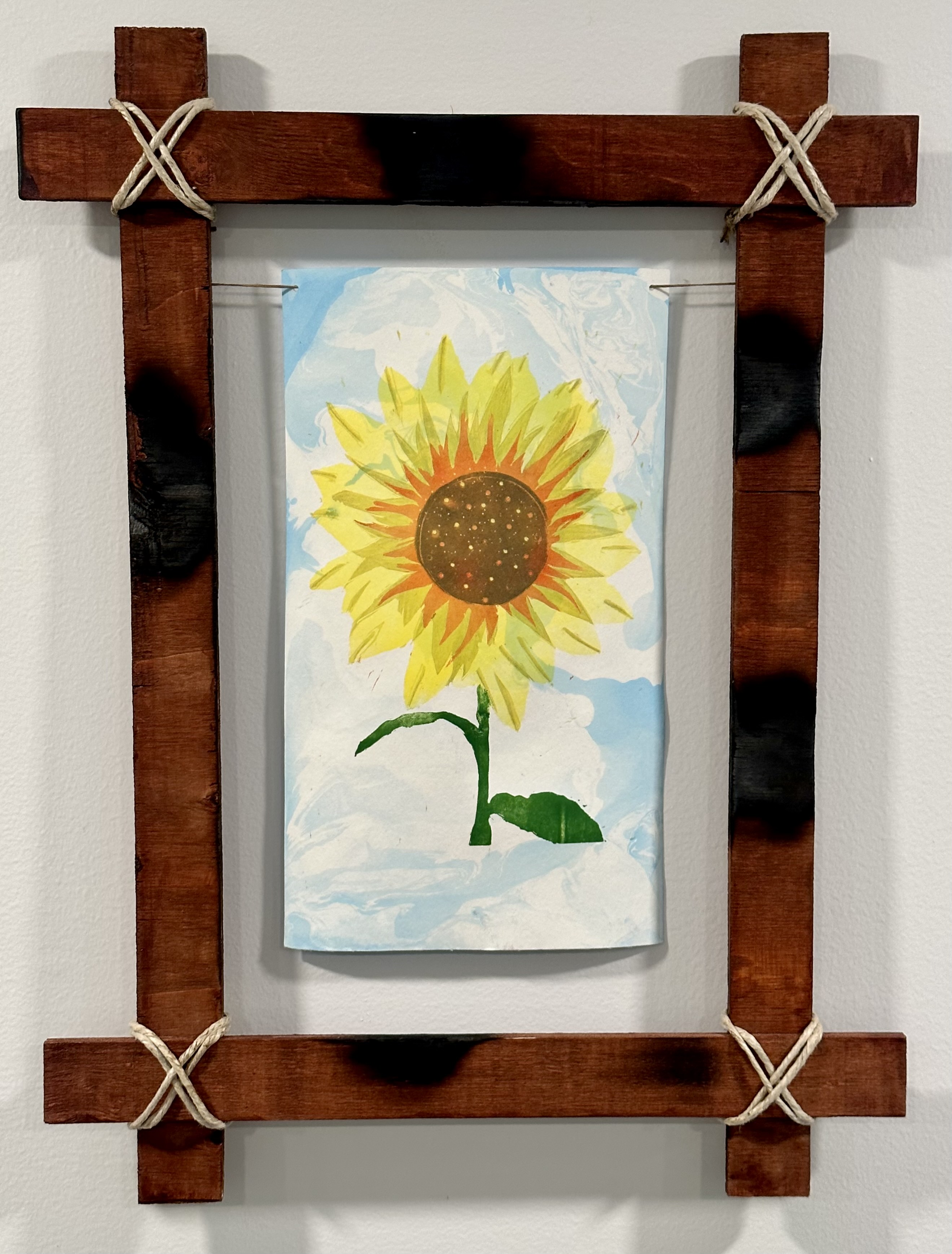 Поскольку я задумала художественную книгу, то сделала для нее много оттисков подсолнечника. Они напечатаны в книге, но я решила продолжить проект, поскольку у меня были оригинальные оттиски. Моя подруга из Украины спросила, наберется ли у меня 27 таких оттисков? Именно столько регионов в Украине. И тогда мы решили сделать еще один проект — вариацию подсолнечников в отдельных рамках, каждая из которых представляет регион Украины. Кадры все разные — от относительно простых до символических. Каждый сопровождается небольшим эссе, которые я пишу, чтобы начать дискуссию и показать людям, что происходит в Украине сегодня.