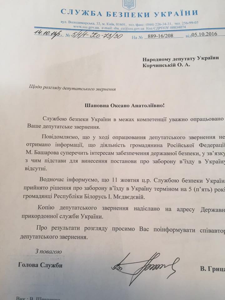 Кроме того, въезд на территорию страны был закрыт также актрисе Ирине Медведевой, которая играет вместе с Маратом Башаровым в спектакле "Сублимация любви", показ которого должен был пройти в Киеве. В деятельности же самого актера СБУ не обнаружила угрозы национальной безопасности Украины.