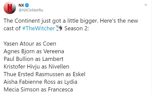 Стриминговый сервис Netflix назвал имена семи новых актеров, которые сыграют во втором сезоне сериала "Ведьмак". Информацию опубликовали на странице сервиса в Twitter.