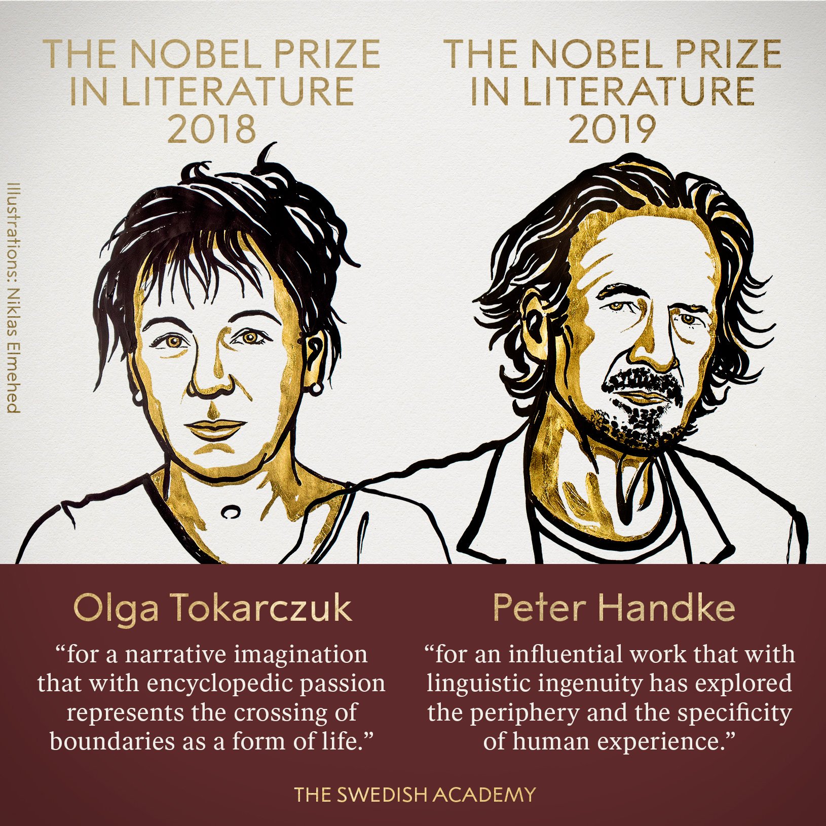Нобелевская премия по литературе 2018 года присуждена польской писательнице Ольге Токарчук с формулировкой "за нарративное воображение, которое с энциклопедической страстью представляет пересечение границ как форму жизни". В 2019 году лауреатом премии стал австрийский писатель и переводчик Петер Хандке. Ему премию присудили с формулировкой "за влиятельную работу, которая с лингвистической изобретательностью исследовала периферию и специфику человеческого опыта".