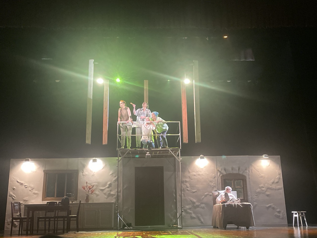 В одном из интервью Оксана Гриценко поделилась, что прототипы героинь пьесы — собирательные образы женщин, которые она создавала на основе своего жизненного опыта, интервью с женщинами, которые пережили оккупацию, смогли выехать, и историй от родственников, оставшихся на тех территориях. Как человек, который родился и вырос в селе, я понимаю, что региональный суржиковый язык — явление тотально господствующее. В «Молочайнику», наверное, странно было бы слышать чистый литературный украинский язык. Но искусственного суржика в спектакле так много, что если бы он был строительным материалом, то хватило бы перекрыть еще минимум две-три крыши.