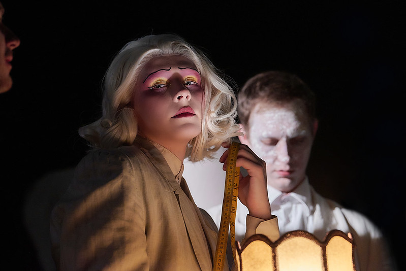 Обшарпанные дверь и шкаф, желтоватые абажуры, трюмо и ширма, граммофон, старое кресло, накрытое вязаным пледом, — все в пастельно-кремовых тонах. Есть сцены, когда вещи оживают, например кресло танцует с торшером. Мне это напомнило мультфильм «Красавица и чудовище», в котором действовали подсвечник, посуда и другие предметы интерьера. Все как пьянящий сон, такая же абстрактность, с которой пытается бороться Йозеф.