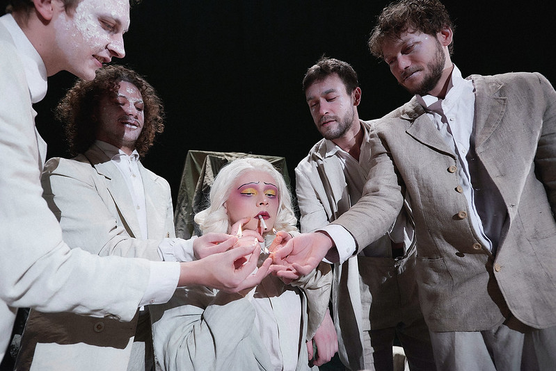 Своей внешностью секретарша адвоката Лене в воплощении Артема Каратаева напоминает фарфоровую куклу, а ее макияж и ярко-розовые чулки делают ее похожей на танцовщиц кабаре. Она манерная, но грубоватая; грациозная, но жесткая. Единственная героиня, единственный женский образ в постановке и тот в исполнении актера, не актрисы. Режиссер отказался от понятия гендера — акцент на характеры и психофизику.