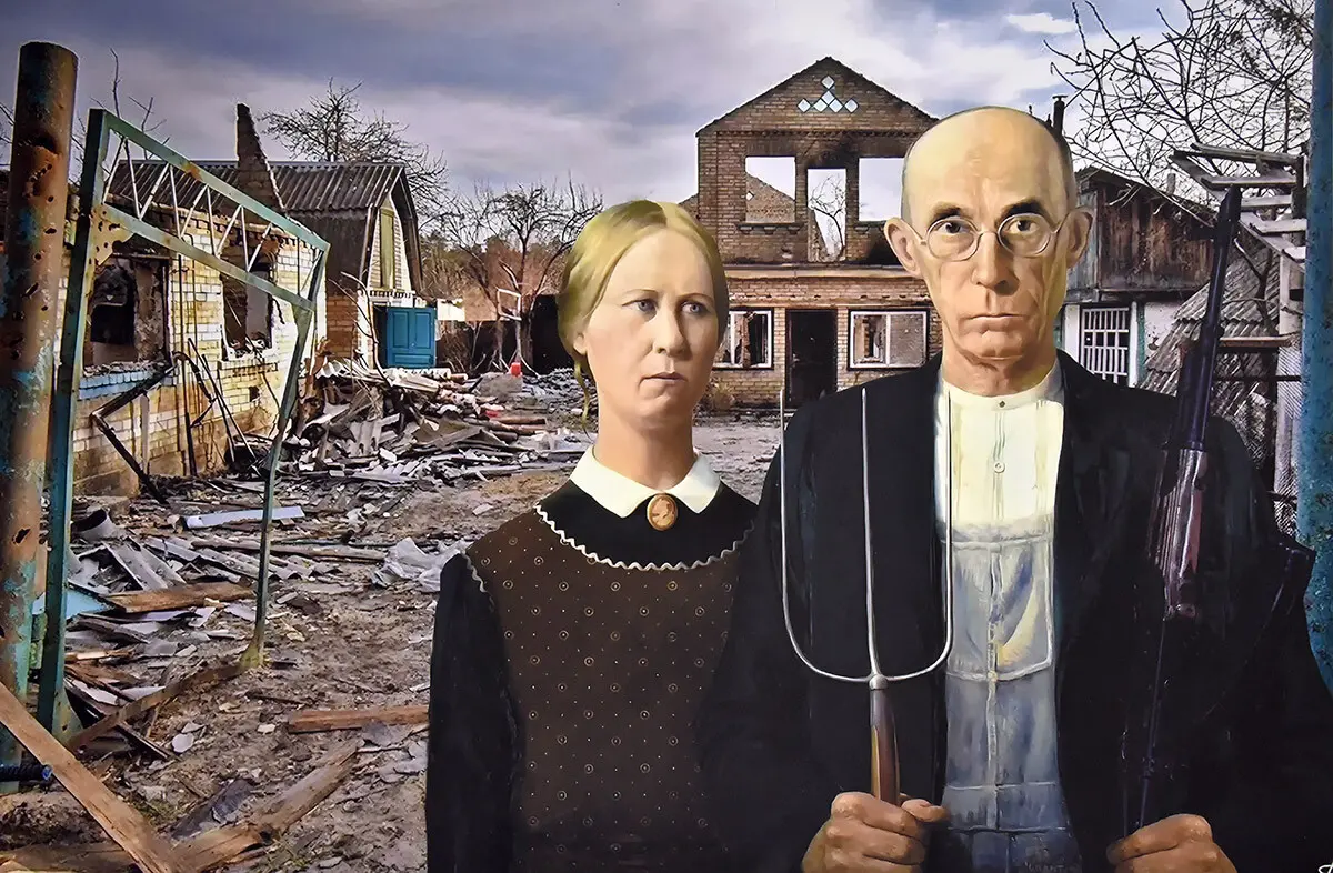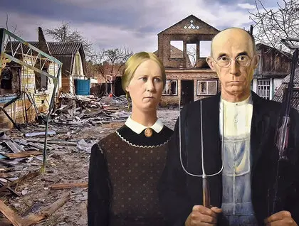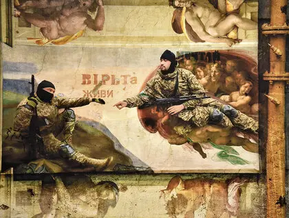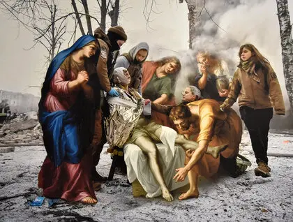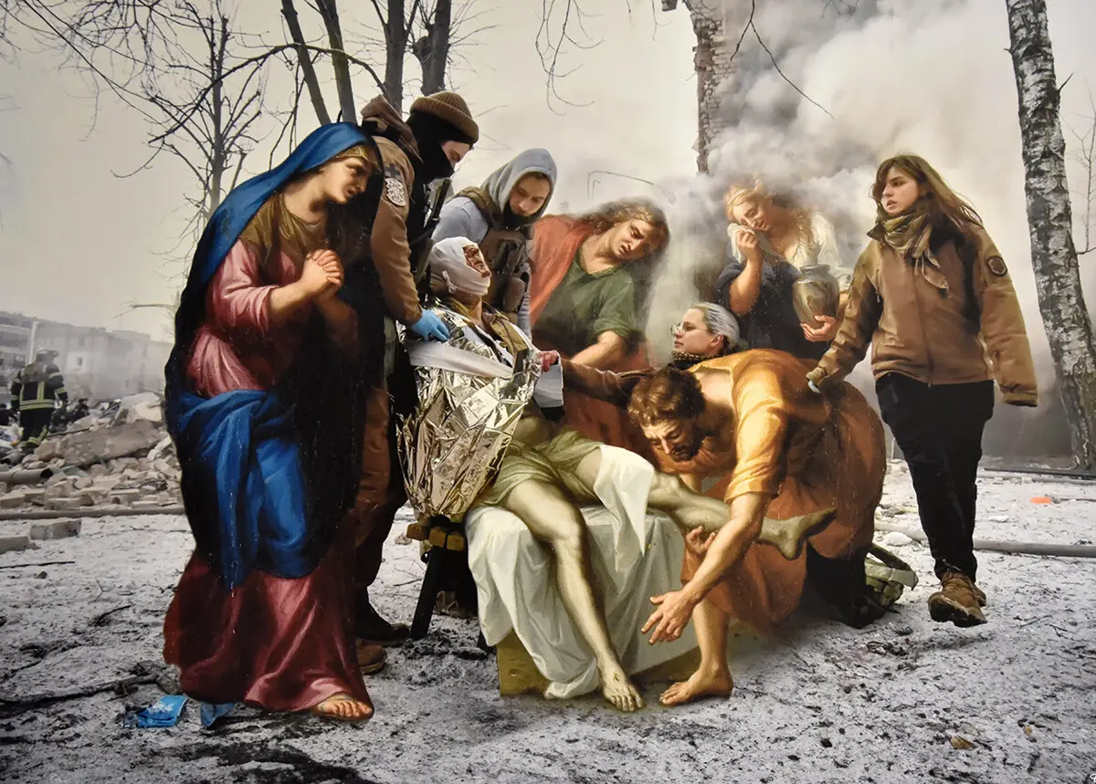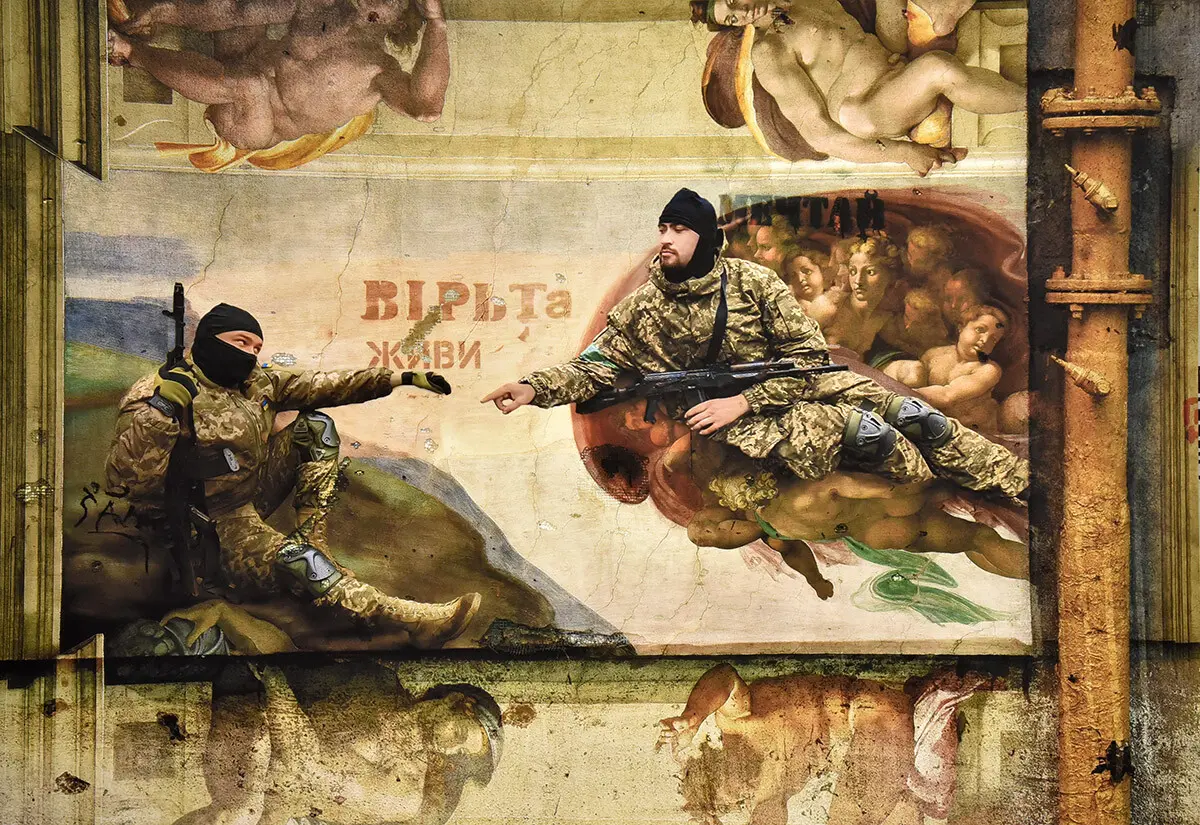 Фанни Лешевалье — современная художница из Франции, которая в своем творчестве сочетает документальные фотографии с классической живописью Западной Европы. Ее техника — фотомонтаж: на классические полотна европейской живописи она накладывает реальные кадры войны, сделанные военными фотокорреспондентами в Украине. В результате возникают глубоко символические визуальные композиции, где античные герои и религиозные сюжеты уступают место разрушенным зданиям, портретам военных, гражданских, детей.