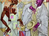 Джазовая серия посвящена пластике музыкального ритма. Удлиненные фигуры, акцентированные руки и вибрация линий создают визуальный эффект звучания. Музыканты изображены в момент действия, а движение подается как элемент импровизации. "Они будто составлены из фрагментов дерева, металла и древней фактуры", — отмечают кураторы об особенностях стиля художника.