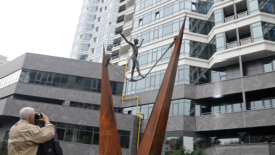 Как сообщает пресс-служба КГГА, шестиметровая композиция получила название "Равновесие", поскольку во время сильного ветра скульптура слегка раскачивается. По замыслу автора, девочка удерживает равновесие на канате, символизирует баланс и гармонию человека с окружающей средой в нашем динамичном и неустойчивом мире.