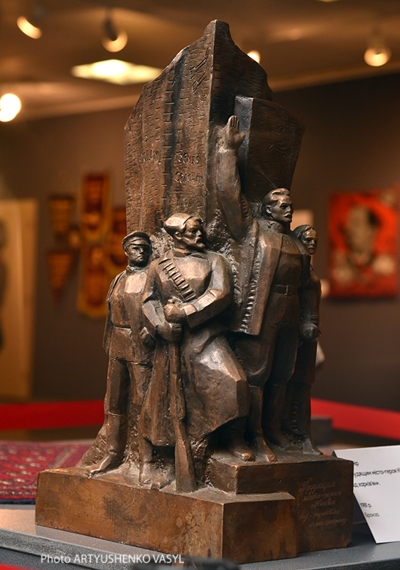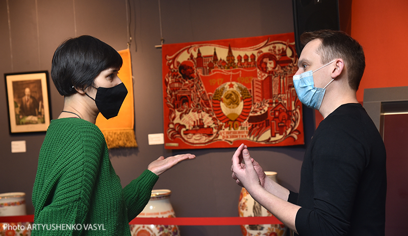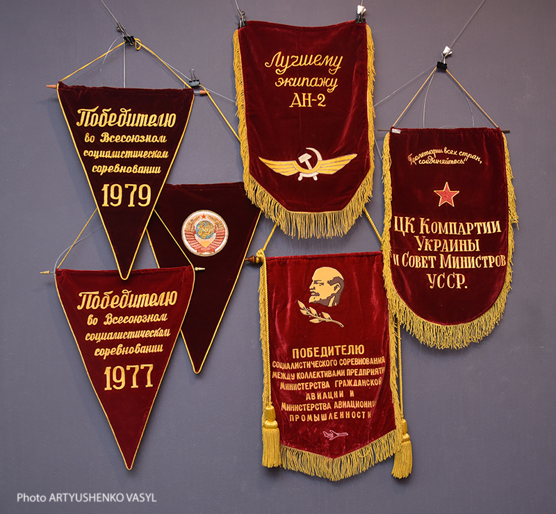 Музей истории Киева владеет не только богатой коллекцией изобразительного и декоративного искусства советской поры. В собрании немало красноречивых артефактов, сопровождавших человека всюду, иногда даже дома: флаги, разнообразные вымпелы-отличия, открытки, сувенирная продукция разного уровня – от дешевых тарелок с петриковской росписью до пафосных фарфоровых ваз с портретами Ленина, от изысканных идеологически окрашенных предметов до откровенного кича.