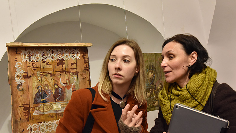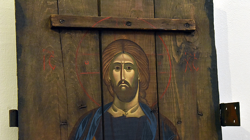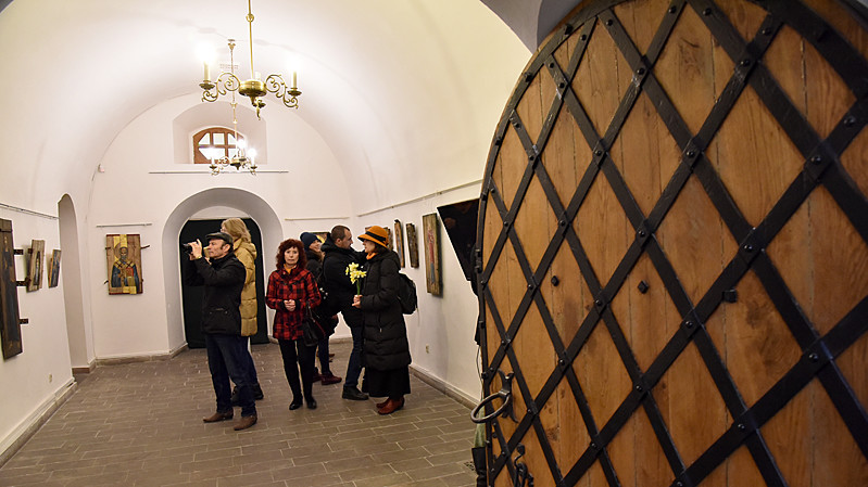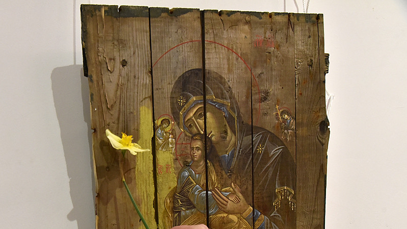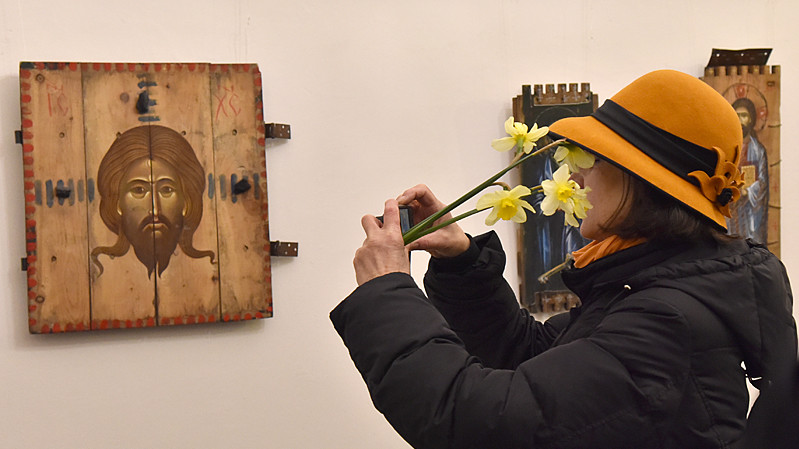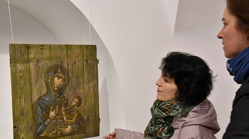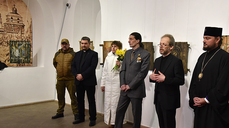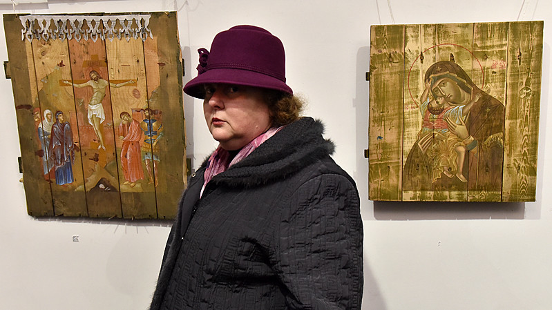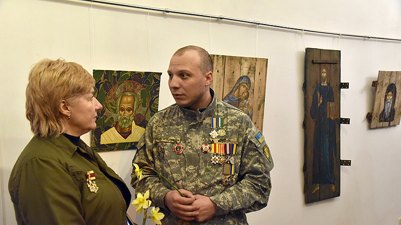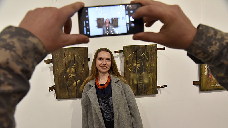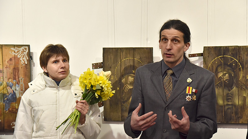 В национальном заповедники "София Киевская" открылась выставка икон, написанных художниками Софией Атлантовой и Александром Клименка. Работы выполнены на досках ящиков из-под патронов, привезенных из зоны боевых действий в Донбассе.