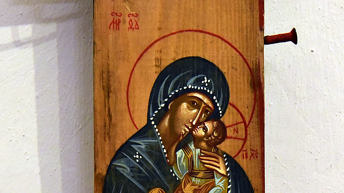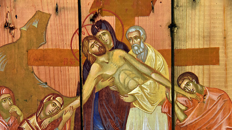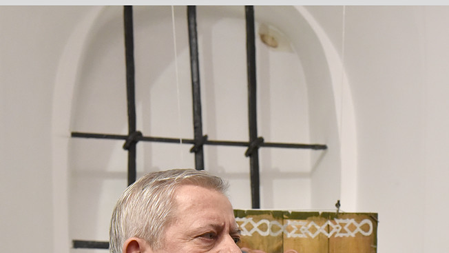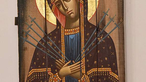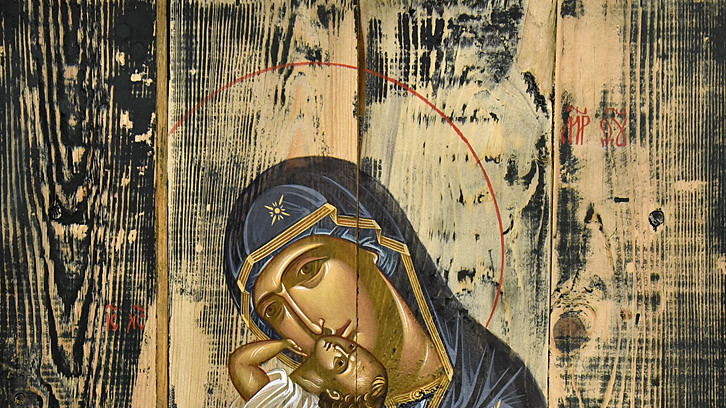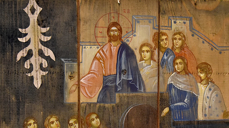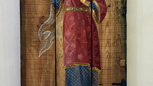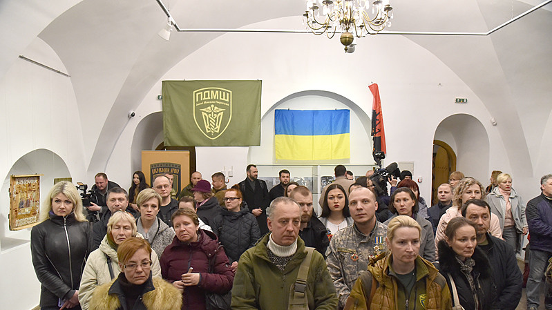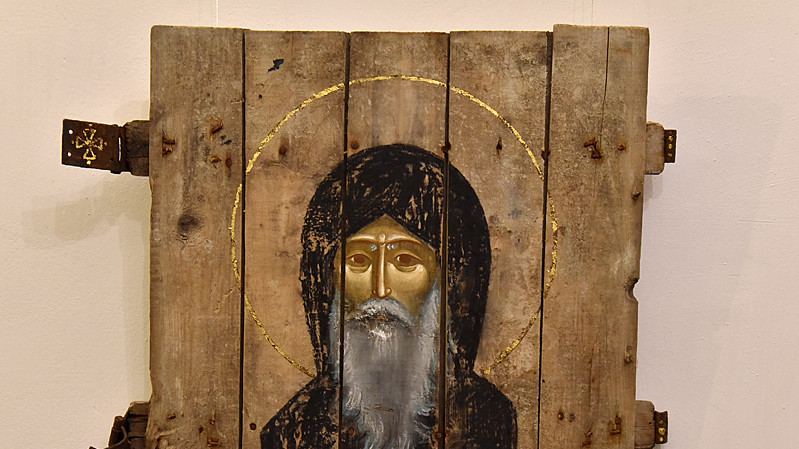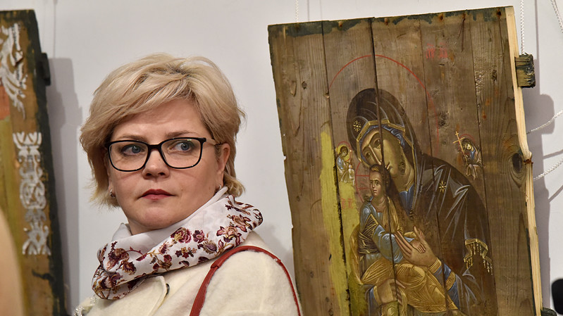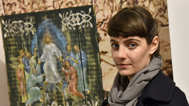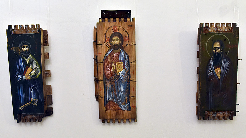 В национальном заповедники "София Киевская" открылась выставка икон, написанных художниками Софией Атлантовой и Александром Клименка. Работы выполнены на досках ящиков из-под патронов, привезенных из зоны боевых действий в Донбассе.