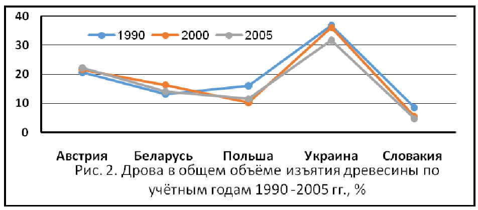 Приводим лишь один пример с лесохозяйственного производства по Украине (см. рис.) в сравнении с соседними зарубежными странами, используя данные информационной таблицы Глобального отчета ЕЭК ФАО Trends in removals of wood products 1990-2005 (по расчетам автора на основе данных GFRA_2010).
