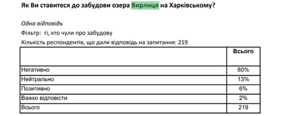 Наверное, поэтому результаты социологического исследования компании Gradus в этом году показали: киевляне внимательно следят за действиями недобросовестных застройщиков, которые уничтожают зеленые зоны. 94% киевлян категорически не одобряют уничтожение зеленых зон под создания новых ТРЦ или жилищных комплексов, понимая важность сохранения островков охлаждения. Ни один киевлянин или киевлянка не ответили, что зеленые зоны не приносят пользы. В вопросе сохранения водоемов позиция громады тоже четкая. Согласно результатам исследования, отрицательно к застройке Вырлицы относятся 80% опрошенных.