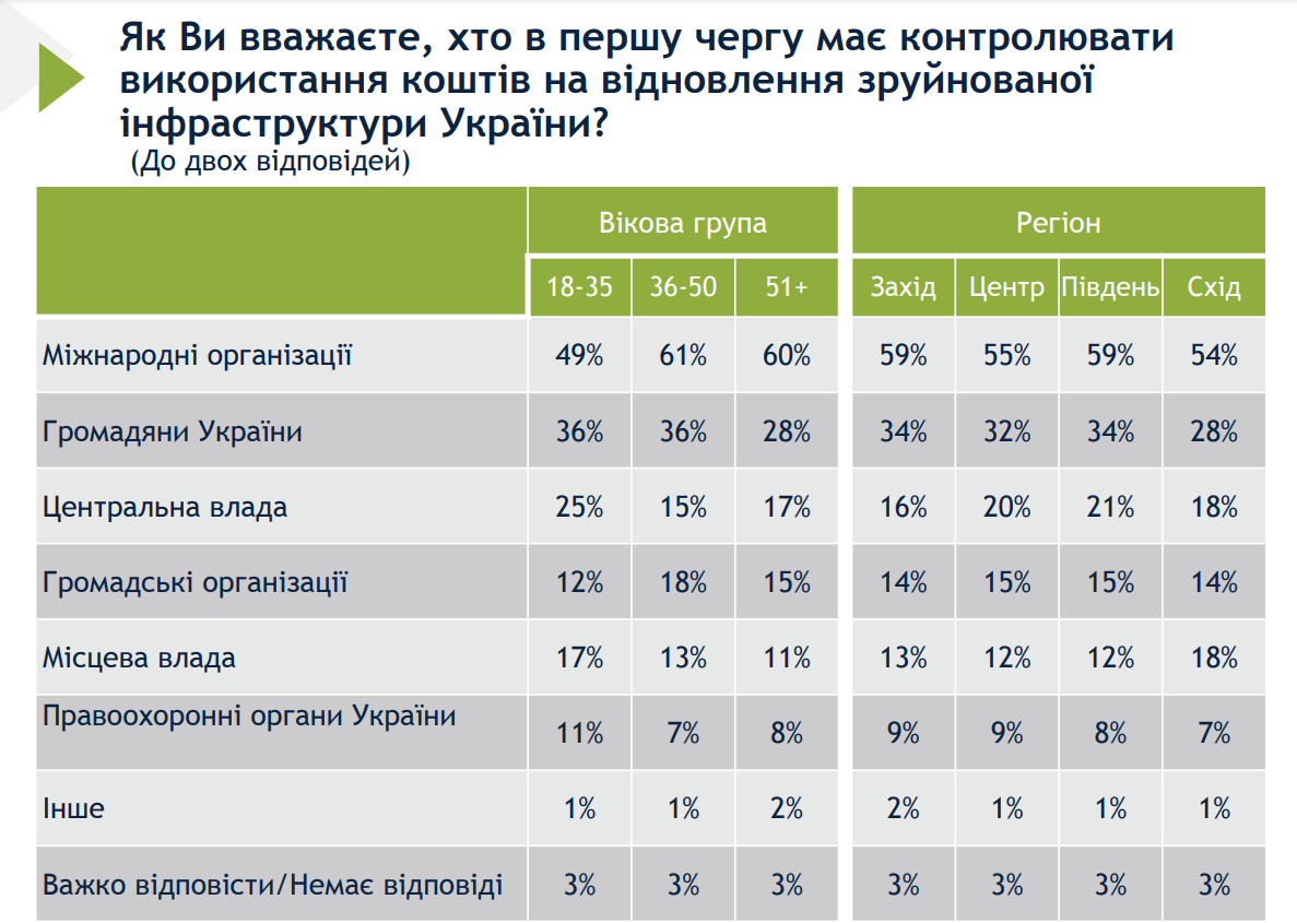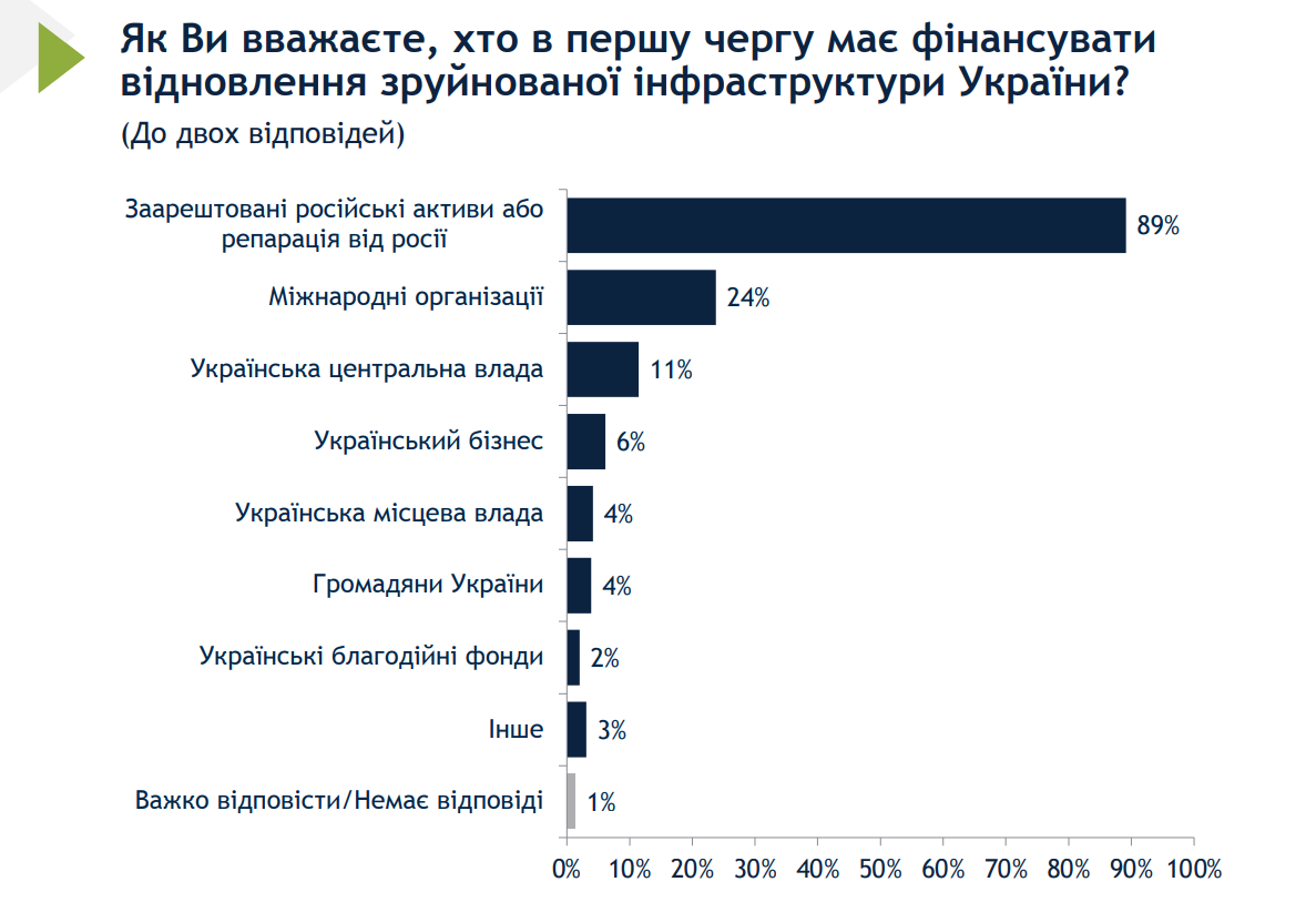 Кроме того, исследование продемонстрировало убежденность подавляющего большинства опрошенных украинцев в том, что восстановление уничтоженных объектов в первую очередь должна финансировать именно Россия. 89% участников опроса желают, чтобы деньги шли из арестованных активов РФ и репараций.