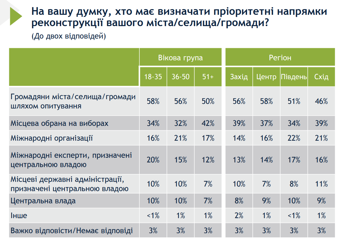 Более половины опрошенных граждан (54%) также указали, что приоритетные направления восстановления в их населенных пунктах должны определять они сами вместе с другими жителями путем опроса.