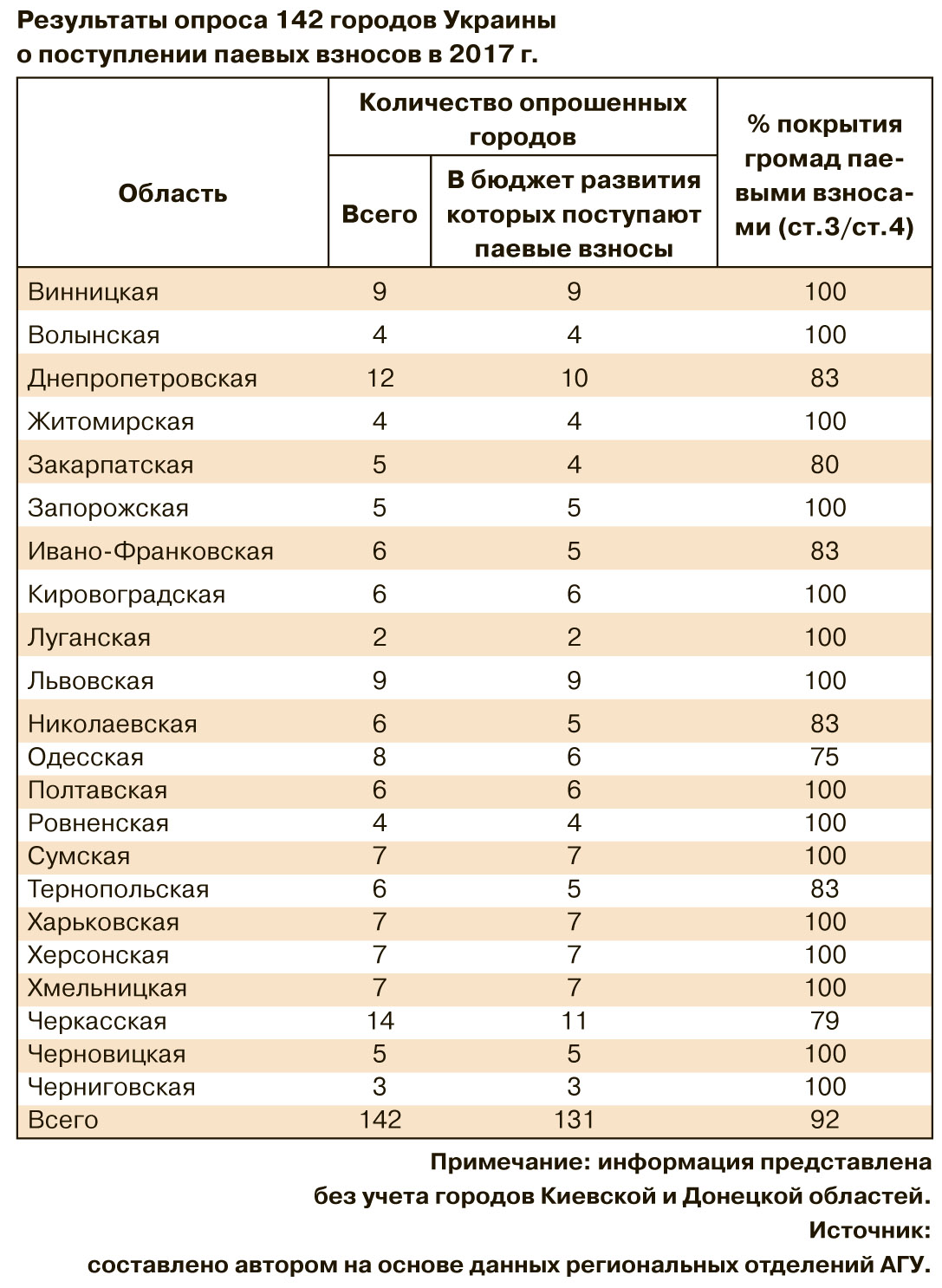 Долевое участие не является административным сбором за получение одного из разрешительных документов на начало строительства. Это необходимый вклад в развитие инфраструктуры соответствующего населенного пункта. После окончания строительства эта инфраструктура будет эксплуатироваться с дополнительной нагрузкой. Хотя не все местные бюджеты получают паевые взносы, однако, как показал анализ, охват этим видом поступлений не такой уж и низкий. Ассоциация городов Украины провела опрос 142 городов (почти половина от их общего количества). В результате было выявлено, что 92% опрошенных городов получают паевые взносы от застройщиков.