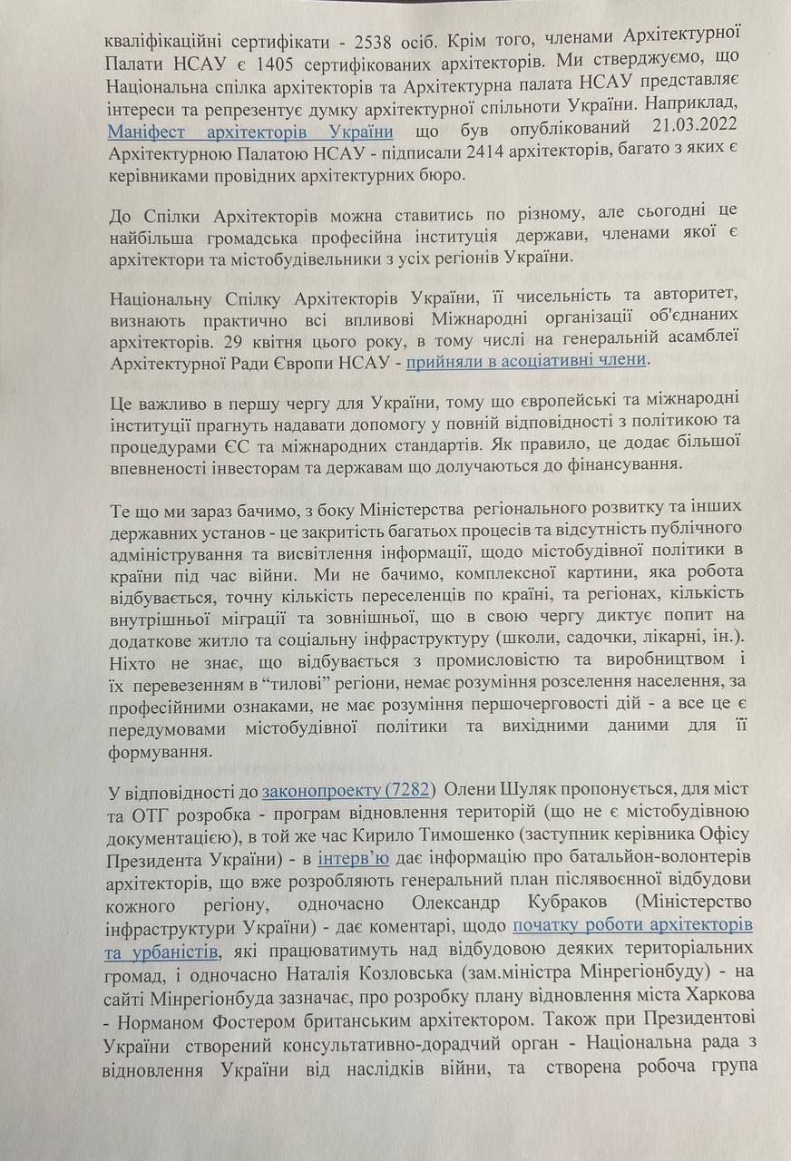 В соответствии с законопроектом ( №7282 ) Елены Шуляк предлагается, для городов и ОТГ разработка - программ восстановления территорий (не являющейся градостроительной документацией), в то же время Кирилл Тимошенко (заместитель руководителя Офиса Президента Украины) - в интервью дает информацию о батальоне-волонтеров архитекторов, уже разрабатывающих генеральный план послевоенного восстановления каждого региона, одновременно Александр Кубраков (Министерство инфраструктуры Украины) - дает комментарии относительно начала работы архитекторов и урбанистов, которые будут работать над восстановлением некоторых территориальных общин, и одновременно Наталья Козловская (замминистра) – на сайте Минрегионстроя отмечает разработку плана восстановления города Харькова – Норманом Фостером британским архитектором. Также при Президенте Украины создан консультативно-совещательный орган - Национальный совет по восстановлению Украины от последствий войны, и создана рабочая группа "Строительства, градостроительства, модернизации городов и регионов", в которую ни одного представителя из Национального Союза Архитекторов Украины, к сожалению, не было привлечено.