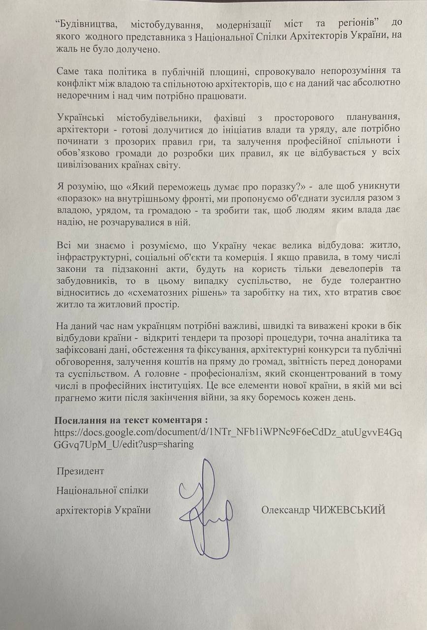 Министерство регионального развития и другие государственные учреждения демонстрируют закрытость в условиях войны многих градостроительных процессов, что создает основание для недоразумений и конфликтов между властью и сообществом архитекторов. Об этом говорится в комментарии президента Национального союза архитекторов Александра Чижевского на интервью главы партии «Слуга народа» Елены Шуляк – «Люди должны получить компенсацию за разрушенное жилье, не дожидаясь репараций России», которое было опубликовано на ZN.UA.
