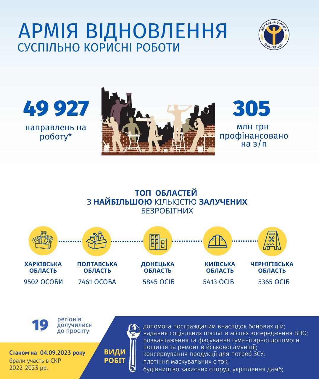 Всего с 1 октября 2022 участие в общественно полезных работах приняли 49 927 украинцев из 19 областей.