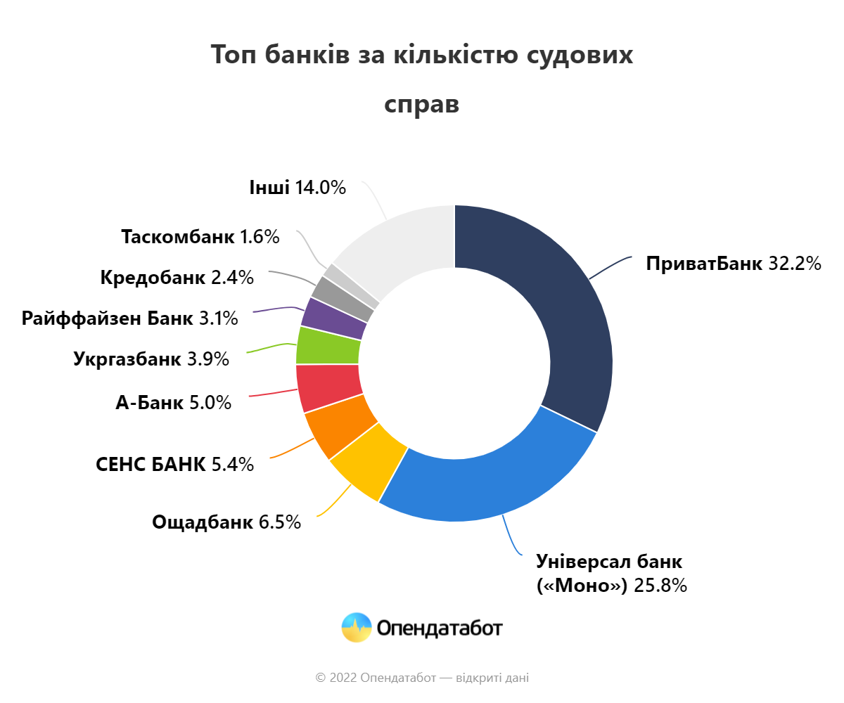 Снизили свою активность в 2022 году даже топ-10 банков, которые чаще всего участвовали в судебных процессах. Так, государственные ПриватБанк и Ощадбанк подали исков вдвое меньше, чем в 2021 году. Наибольшее падение исковой работы наблюдается у А-Банка — в три раза.