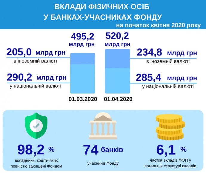 Из общей суммы на начало апреля вклады в гривне составили 285,39 млрд грн; в иностранной валюте - 234,85 млрд грн.