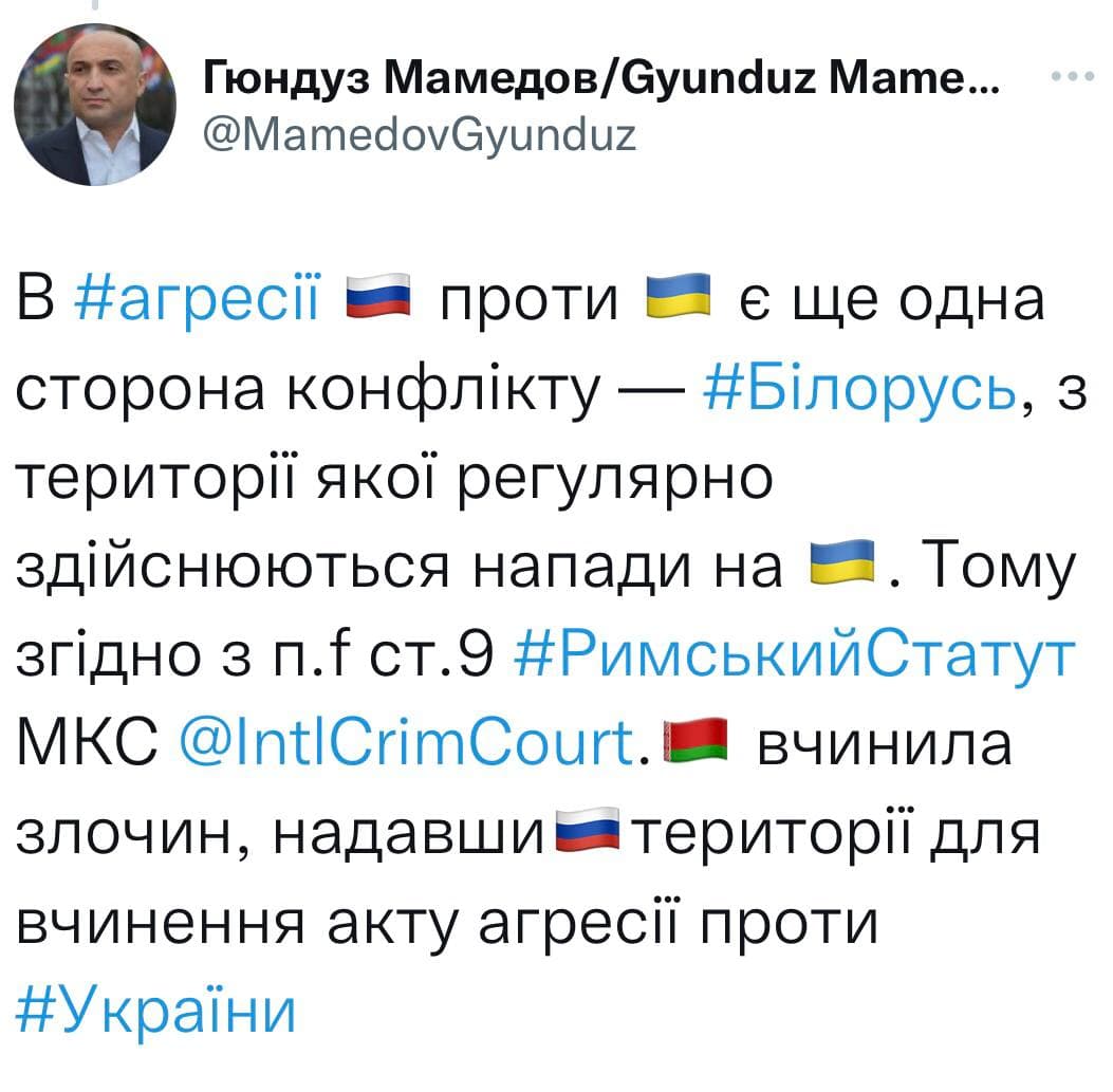 Гюндуз Мамедов, правозащитник, заместитель генерального прокурора (2019-2021 гг.), напомнил, что в агрессии России против Украины есть еще одна сторона конфликта - Беларусь, с территории которой регулярно совершаются нападения на Украину. Об этом он написал в своем Twitter.