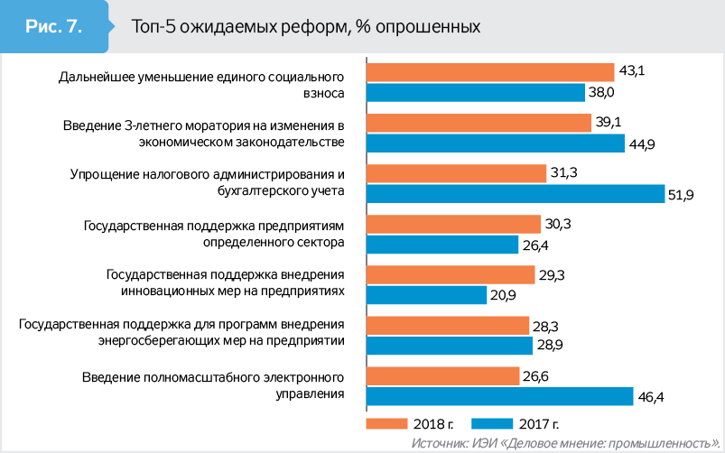 В 2018 г. в первую десятку ожидаемых реформ вошли как меры, направленные на создание благоприятных условий ведения бизнеса, так и впервые за многие годы наблюдений меры, направленные на государственную поддержку. Рейтинг возглавляет потребность в дальнейшем уменьшении единого социального взноса (43,1%), затем идут потребность в стабильности законодательного поля, в частности ожидание трехлетнего моратория на изменения в законодательные акты, регулирующие хозяйственную деятельность (39,1%). Третье место занимает потребность в упрощении налогового и бухгалтерского учета (30,3%). С четвертого по шестое места расположились меры поддержки, которых предприятия ожидают со стороны государства, или предприятиям конкретного сектора, или на конкретные виды деятельности (инновационные предприятия, энергосберегающие меры и т.п.). Седьмое место - за полномасштабным электронным управлением (26,6%). Обеспечение полного возмещения НДС - на восьмом месте, превращение налоговой в сервисную службу - на девятом, а создание действенного механизма выполнения законодательства занимает десятое место.