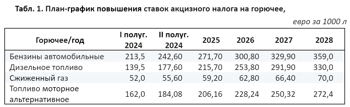 К 2028 году правительство планирует гармонизировать ставки на горючее до уровня ЕС. Для этого предлагается увеличить ставки акцизного налога на горючее до минимального их уровня, предусмотренного Директивой Совета №2003/96/ЕС от 27.10.2003 года. В ЕС минимальные ставки акцизного налога для горючего установлены на этилированный бензин — 359 евро за 1000 л и на газойли (дизельное топливо) — 330 евро за 1000 л.