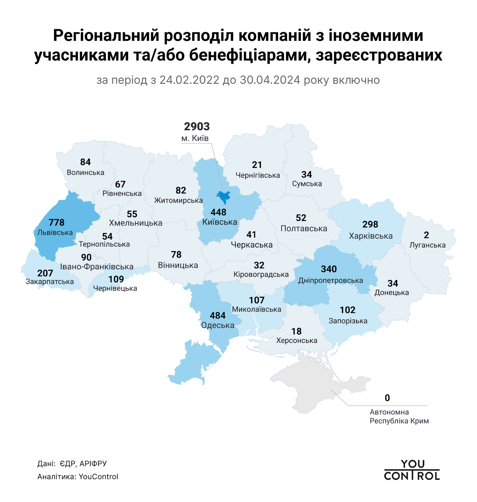 В Едином государственном реестре юридических и физических лиц-предпринимателей есть информация о 2903 компаниях с иностранными инвестициями, зарегистрированных в Киеве. Во Львовской области таких компаний – 800. Есть и другие регионы, где популярны бизнесы с украинскими и иностранными владельцами и инвесторами. Таков результат аналитического исследования инвестиционного пространства в Украине экспертов YouControl за время широкомасштабного вторжения.