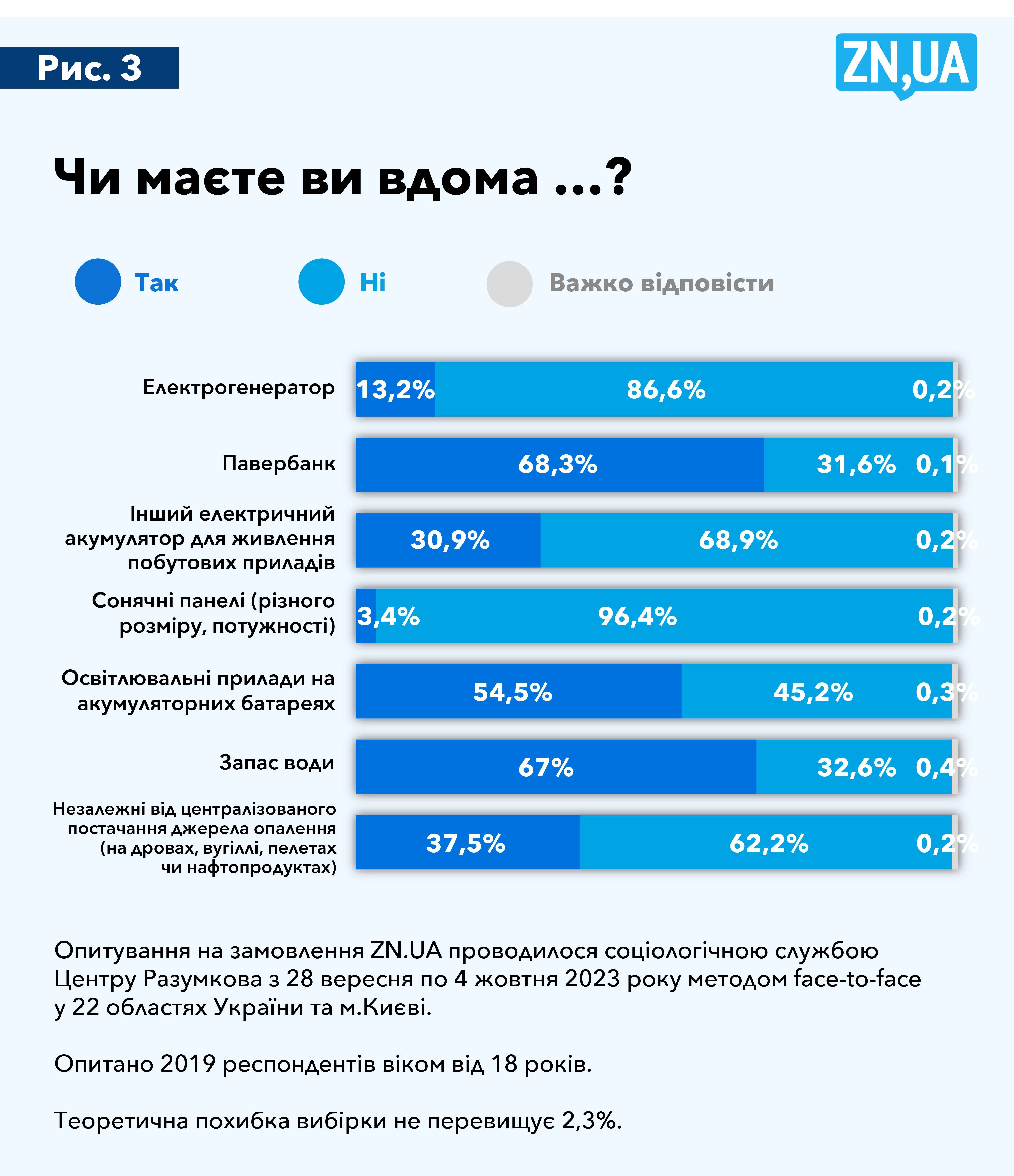 На самом деле изменилось немного: на 7,5% в домах украинцев увеличилось количество аккумуляторов для питания электроприборов, на 5% возросло количество павербанков, почти на 5% прибавилось независимых от централизованного источников отопления. Запасов воды стало меньше, но вполне вероятно, что на момент проведения опроса потребности в их обновлении еще не было. Но в целом изменения несущественны, большинство людей, как и в прошлом, не имеют дома электрогенераторов (86,6%), аккумуляторов для питания бытовых приборов (68,9%), солнечных панелей (96,4%) и независимых от централизованного источников отопления. 62,2%). Главные «спасатели» от блекаутов в Украине – это павербанки (68,3%), аккумуляторные осветительные приборы (54,5%) и запас воды (67%) (см. рис. 3).