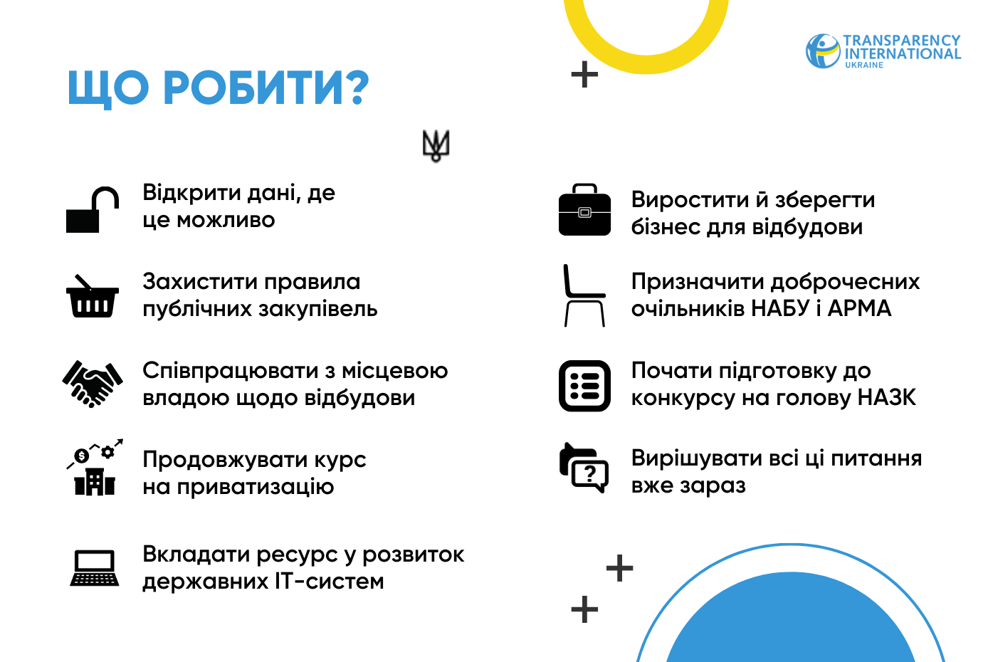 - защитить правила публичных закупок, чтобы восстановление Украины проходило эффективно, прозрачно и конкурентно;